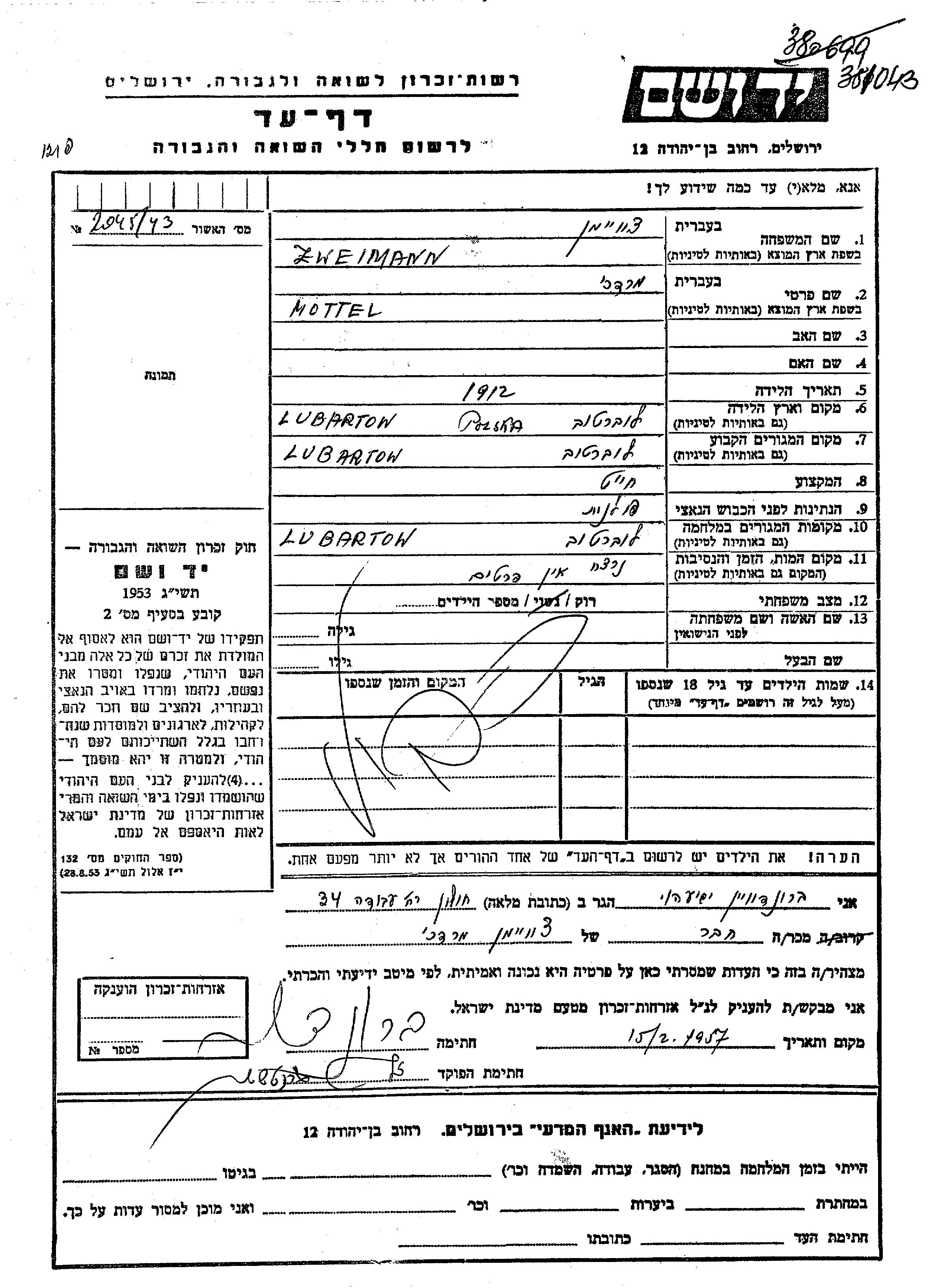 Mottel Zweimann wurde im Jahr 1912 in Lubartow, Polen geboren. Er war Schneider und Ledig. Vor dem Zweiten Weltkrieg lebte er in Lubartow, Polen. Während des Krieges war er in Lubartow, Polen.