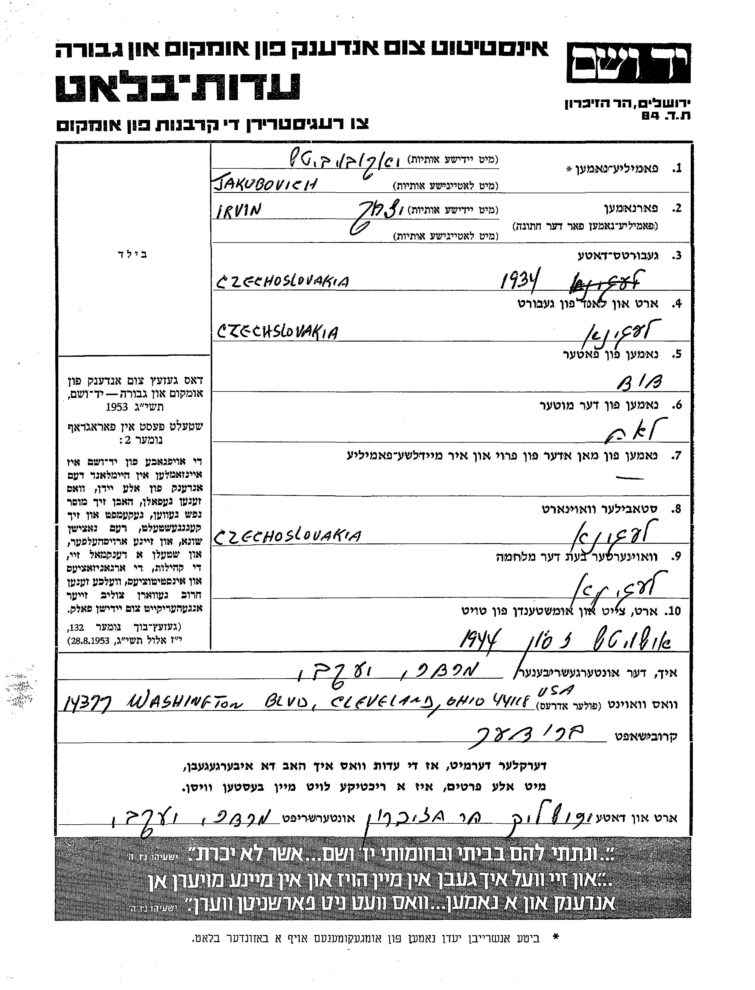 Jakubovich Irvin Yitzkhak 1934 Legina, Tschechoslowakei Gedenkblatt