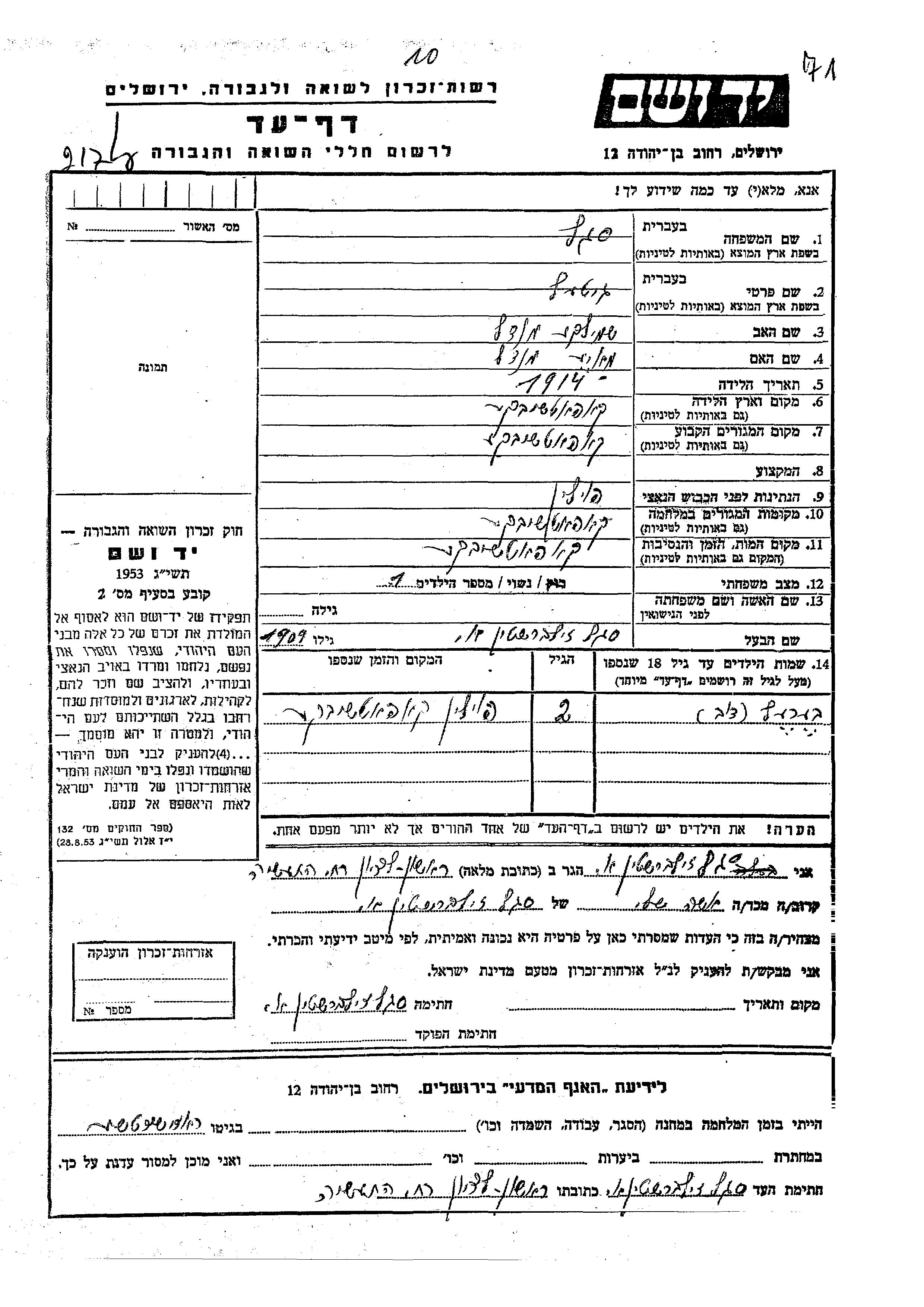Gitel Segal Zilbershtein, geb. Mandel wurde im Jahr 1914 in Kopoczynce, Polen geboren. Sie war die Tochter von Shmuel und Maie. Sie war mit A Verheiratet. Vor dem Zweiten Weltkrieg lebte sie in Kopoczynce, Polen. Während des Krieges war sie in Kopoczynce, Polen.