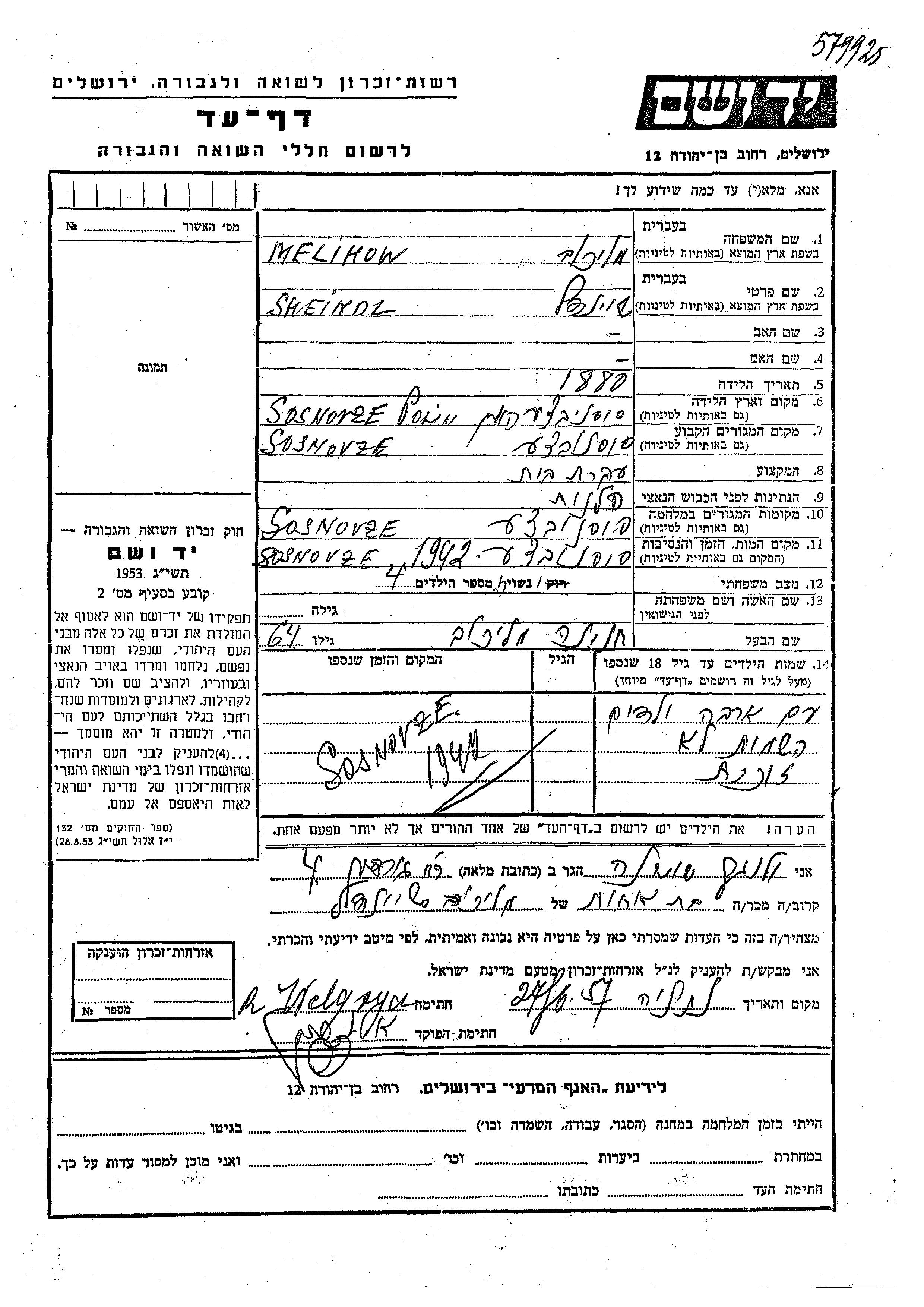 Sheindl Melihow wurde im Jahr 1880 in Sosnovice, Polen geboren. Sie war Hausfrau und mit Khanina Verheiratet. Vor dem Zweiten Weltkrieg lebte sie in Sosnovice, Polen. Während des Krieges war sie in Sosnovice, Polen.