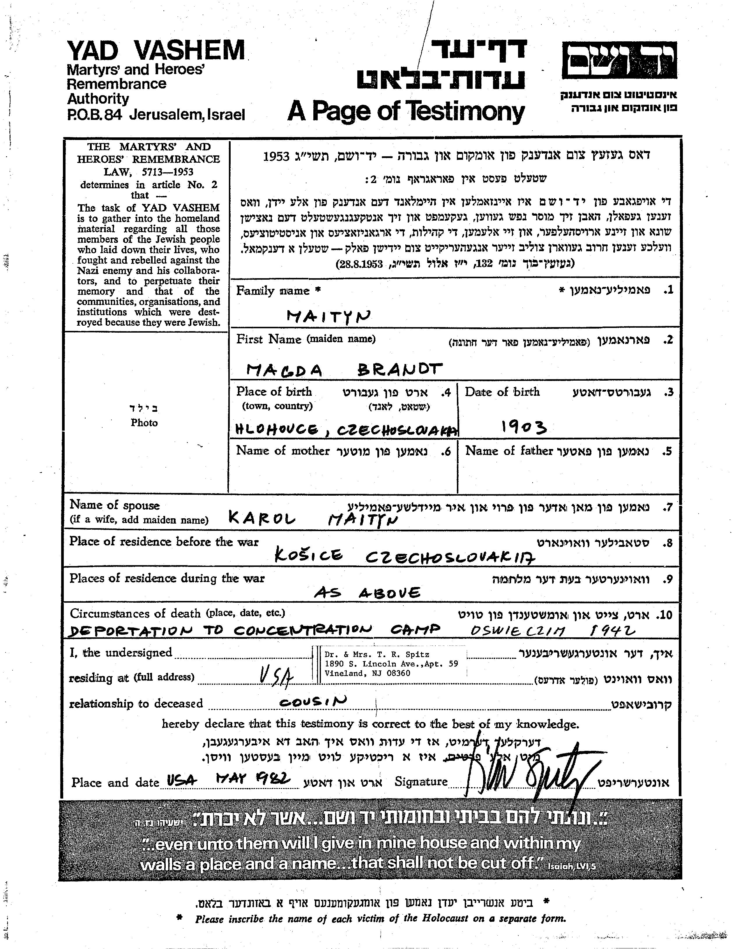 Magda Maityn, geb. Brandt wurde im Jahr 1903 in Hlohovec, Tschechoslowakei geboren. Sie war mit Karol Verheiratet. Vor dem Zweiten Weltkrieg lebte sie in Kosice, Tschechoslowakei. Während des Krieges war sie in Kosice, Tschechoslowakei.