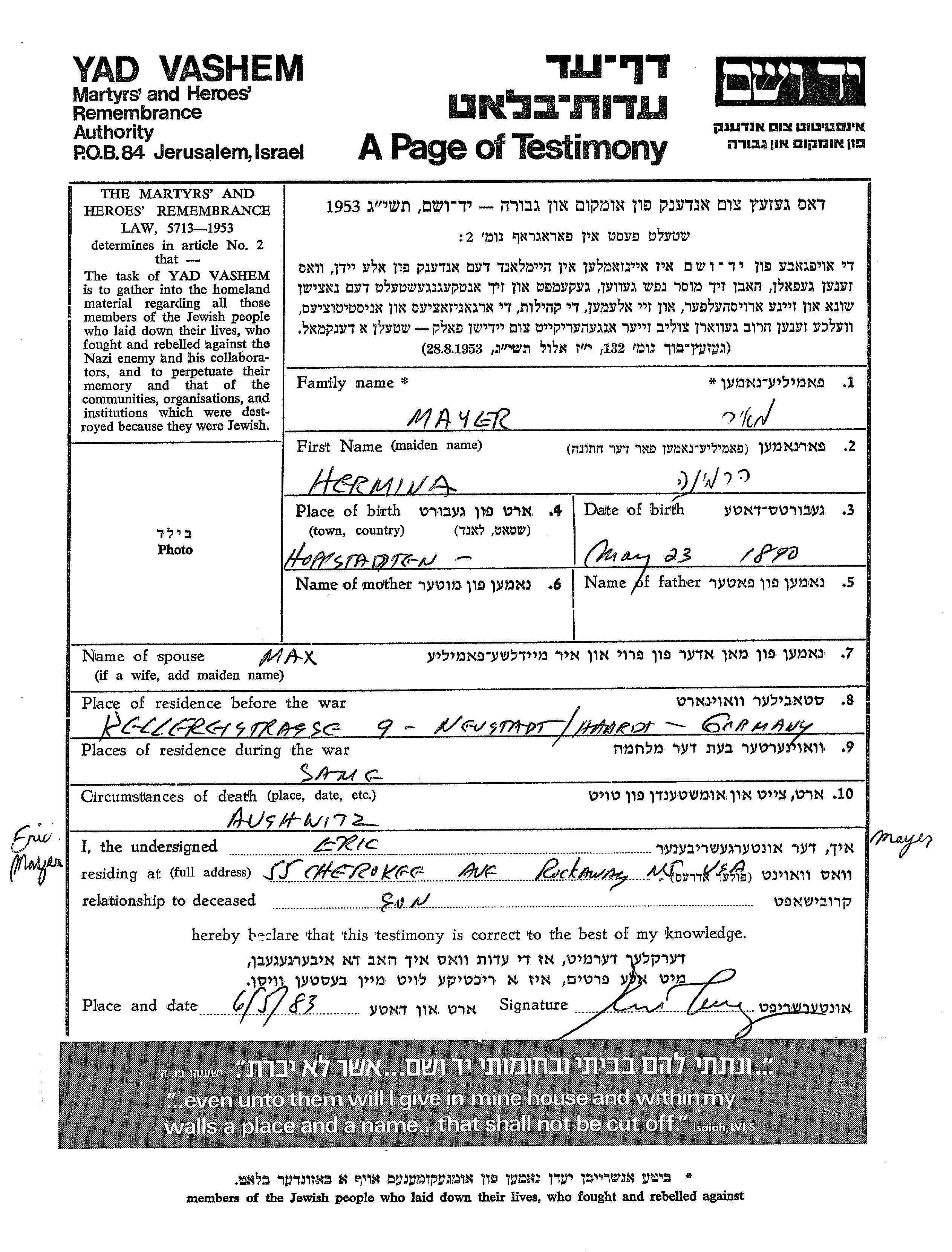 Hermina Mayer wurde im Jahr 1890 in Hoppstaedten, Deutsches Reich geboren. Sie war mit Max Verheiratet. Vor dem Zweiten Weltkrieg lebte sie in Neustadt, Deutsches Reich. Während des Krieges war sie in Neustadt, Deutsches Reich.