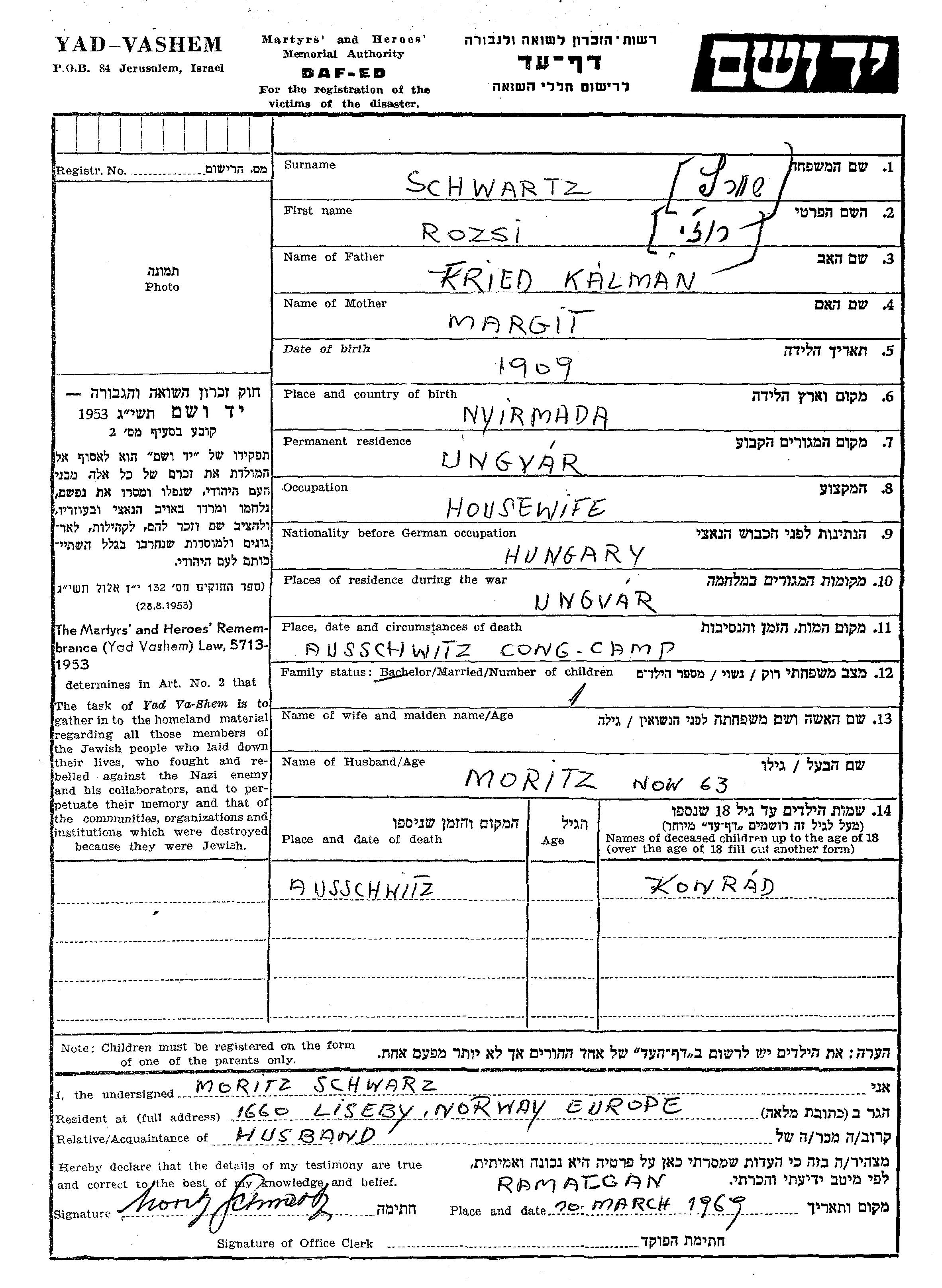 Rozsi Schwartz wurde im Jahr 1909 in Nyirmada, Ungarn geboren. Sie war die Tochter von Fried und Margit. Sie war Hausfrau und mit Moritz Verheiratet. Vor dem Zweiten Weltkrieg lebte sie in Ungvar, Tschechoslowakei. Während des Krieges war sie in Ungvar, Tschechoslowakei.