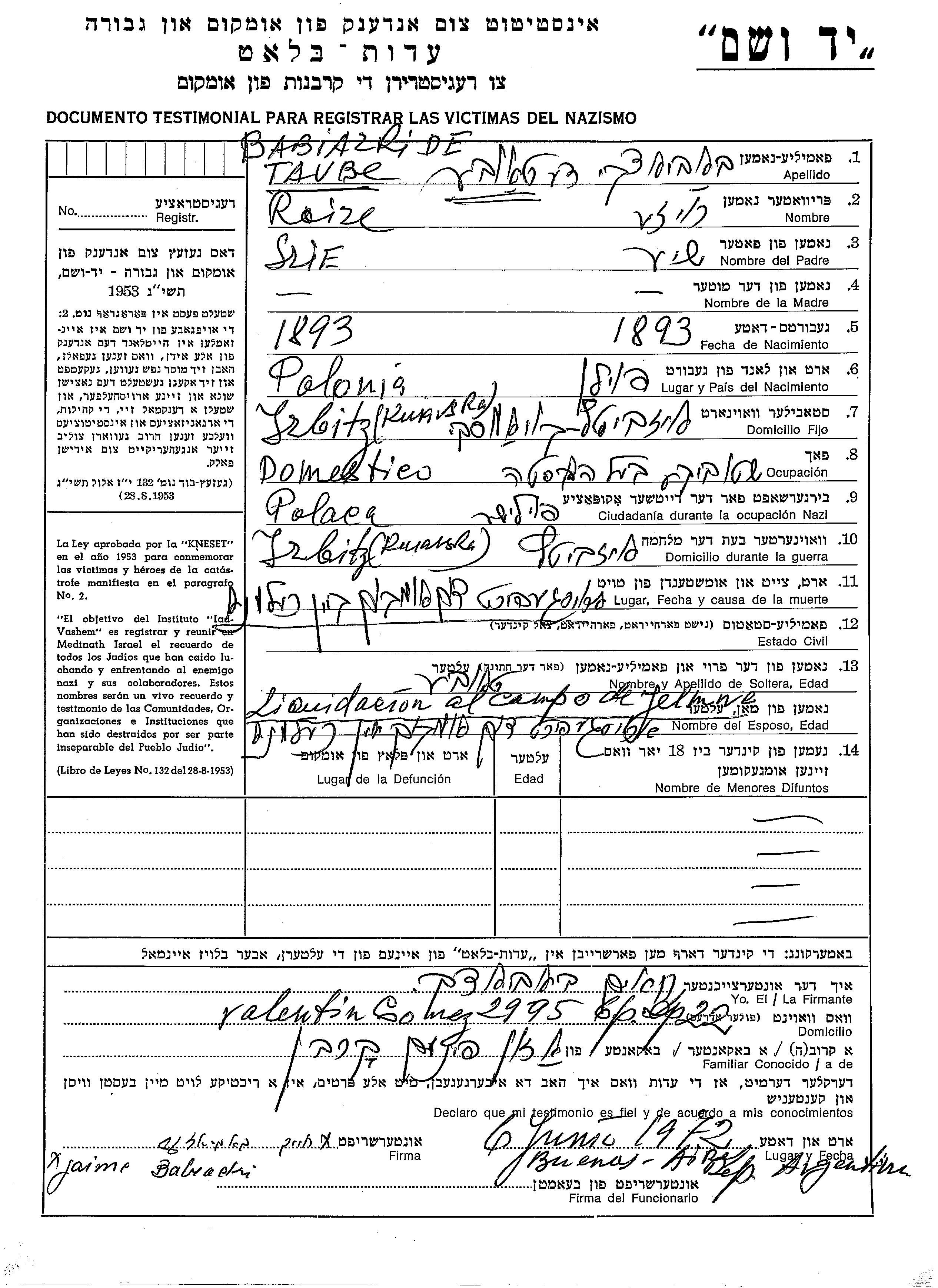 Roize Babiazki, geb. Taube wurde im Jahr 1893 in Polen geboren. Sie war die Tochter von Szie. Sie war Hausfrau und Verheiratet. Vor dem Zweiten Weltkrieg lebte sie in Izbica Kujawska, Polen. Während des Krieges war sie in Izbica Kujawska, Polen.
