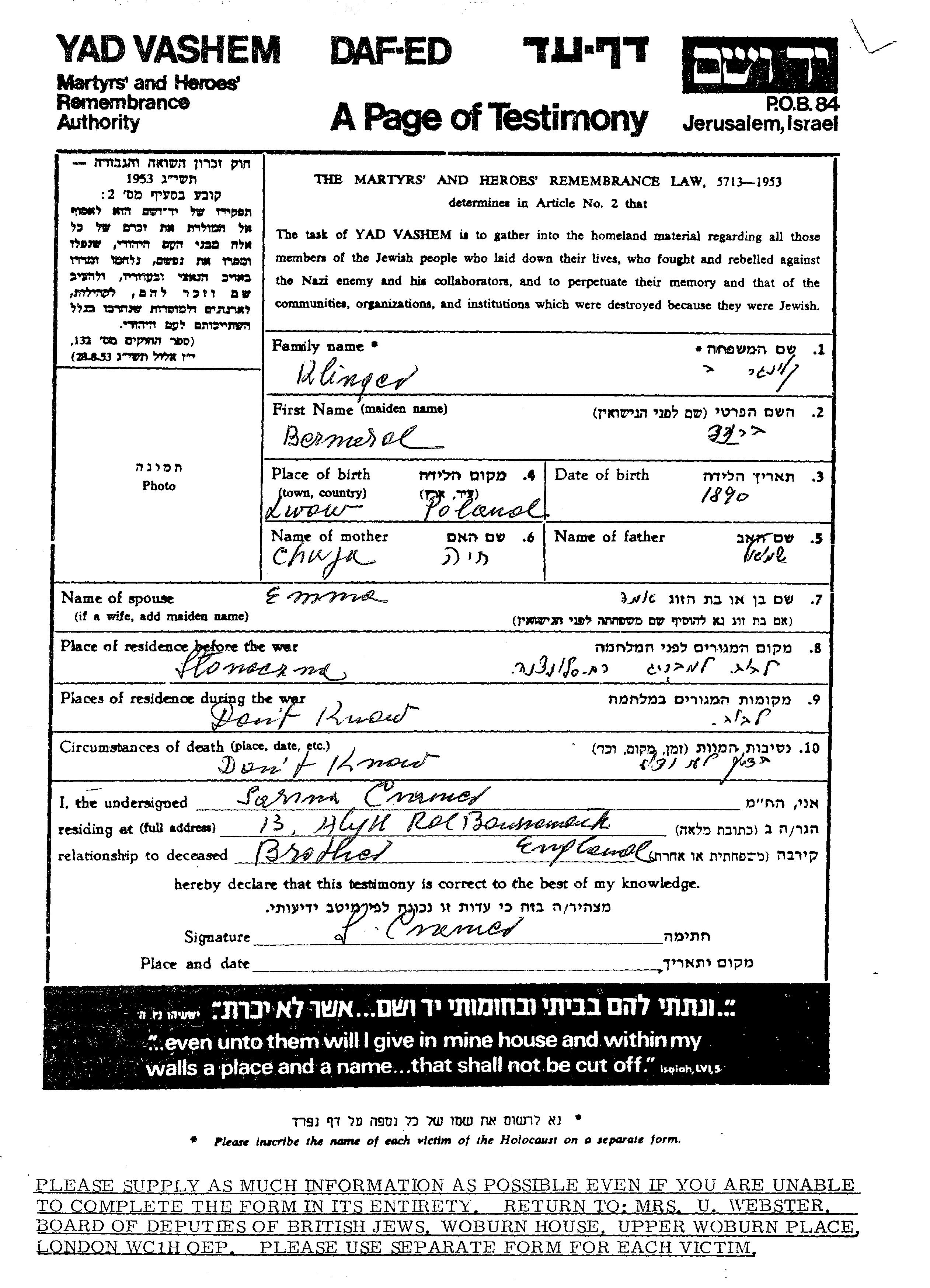 Bernard Klinger wurde im Jahr 1890 in Lwow, Polen geboren. Er war der Sohn von Shmuel und Chaja. Er war mit Emma Verheiratet. Vor dem Zweiten Weltkrieg lebte er in Lwow, Polen. Während des Krieges war er in Lwow, Polen.