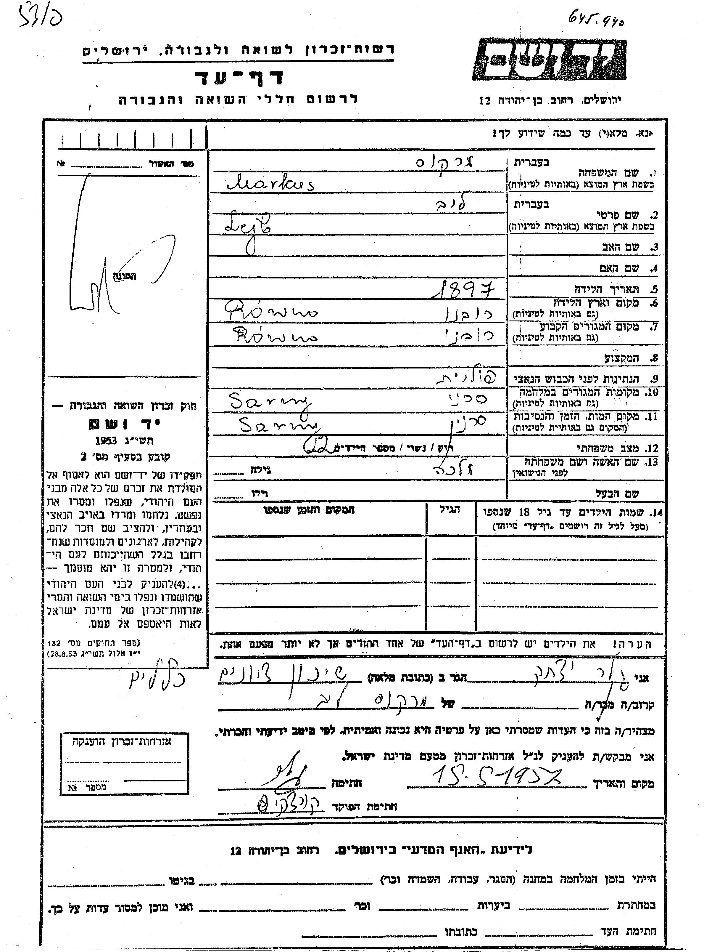 Lejb Markus wurde im Jahr 1897 in Rowno, Polen geboren. Er war mit Malka Verheiratet. Vor dem Zweiten Weltkrieg lebte er in Rowno, Polen. Während des Krieges war er in Sarny.