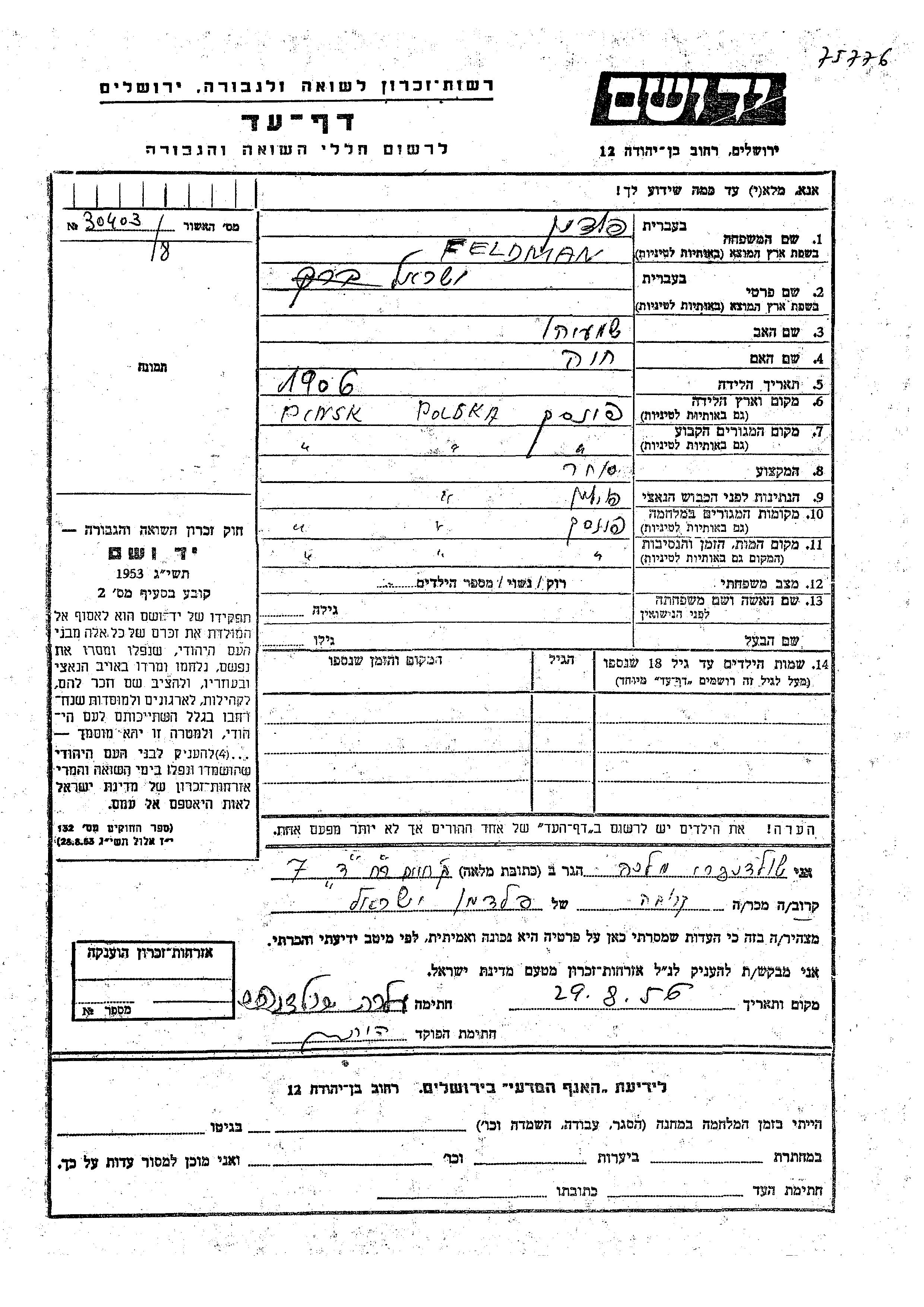 Yisrael Berek Feldman wurde im Jahr 1906 in Pinsk, Polen geboren. Er war der Sohn von Shmaiahu und Khava. Er war Kaufmann/-frau. Vor dem Zweiten Weltkrieg lebte er in Pinsk, Polen. Während des Krieges war er in Pinsk, Polen.