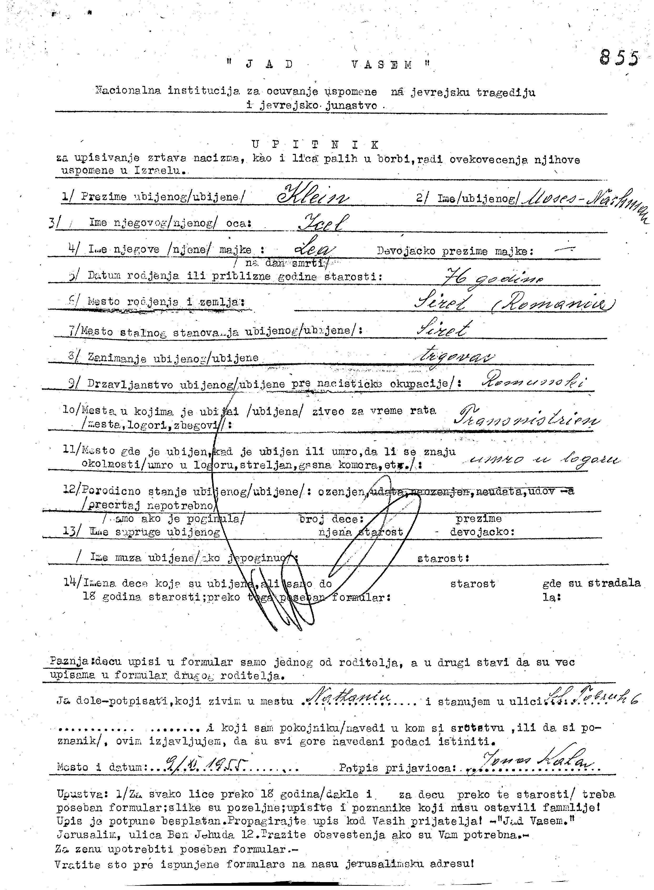 Moses Nachman Klein wurde in Siret, Rumänien geboren. Er war der Sohn von Joel und Lea. Er war Kaufmann/-frau und Verheiratet. Vor dem Zweiten Weltkrieg lebte er in Siret, Rumänien. Während des Krieges war er in Transnistria, Ukraine (UdSSR).