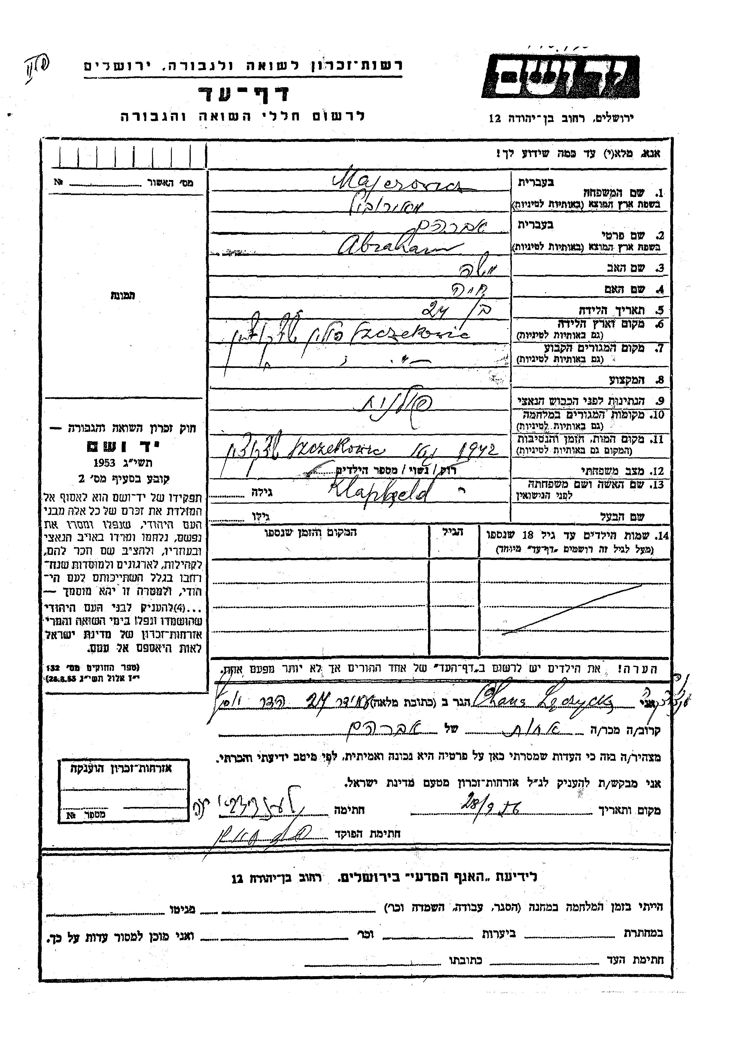 Abraham wurde in der Schoah ermordet. Todesort: Szczekociny, Polen im Jahr 1942.