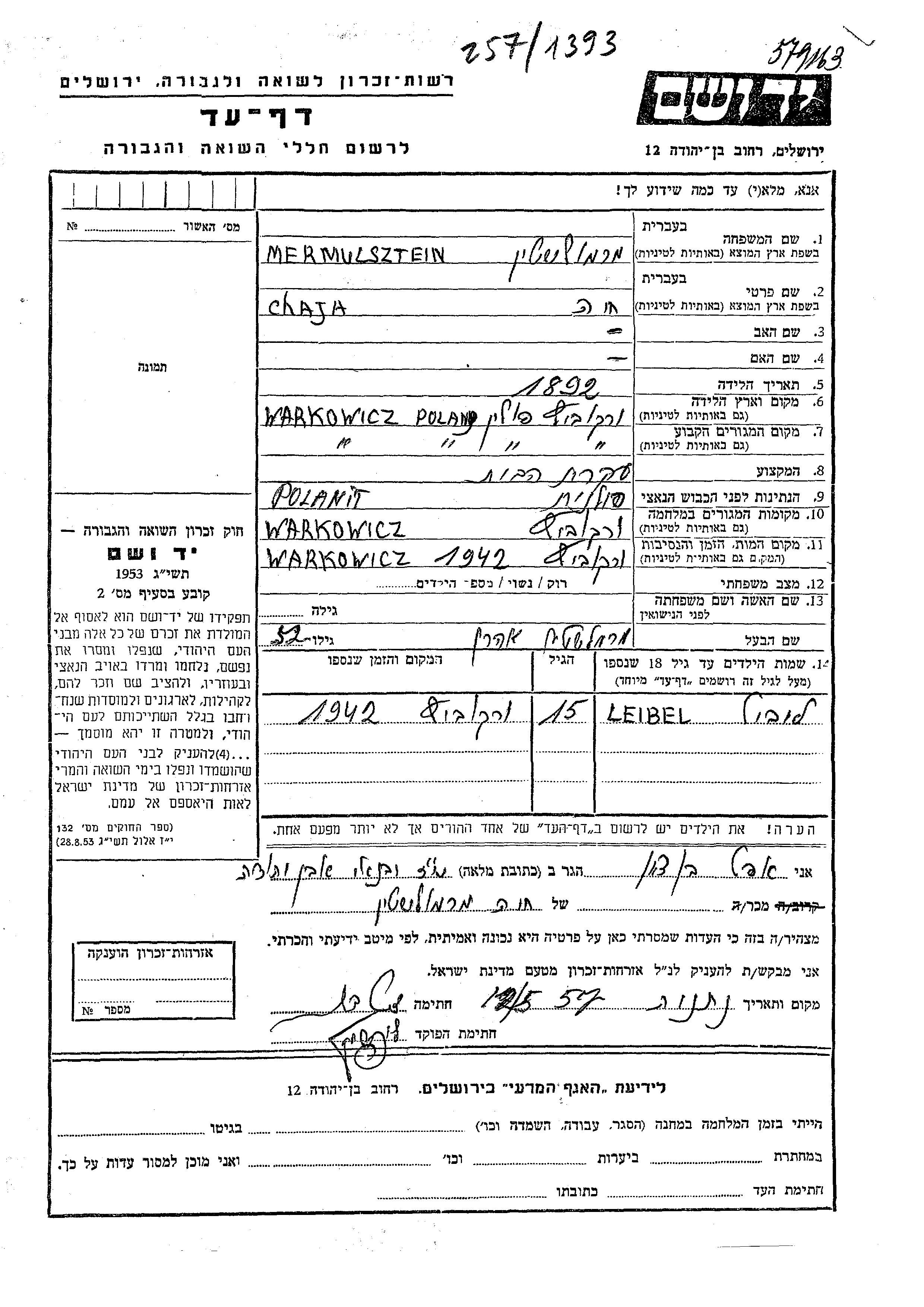 Chaja Mermulsztein wurde im Jahr 1892 in Warkowicze, Polen geboren. Sie war Hausfrau und mit Aharon Verheiratet. Vor dem Zweiten Weltkrieg lebte sie in Warkowicze, Polen. Während des Krieges war sie in Warkowicze, Polen.