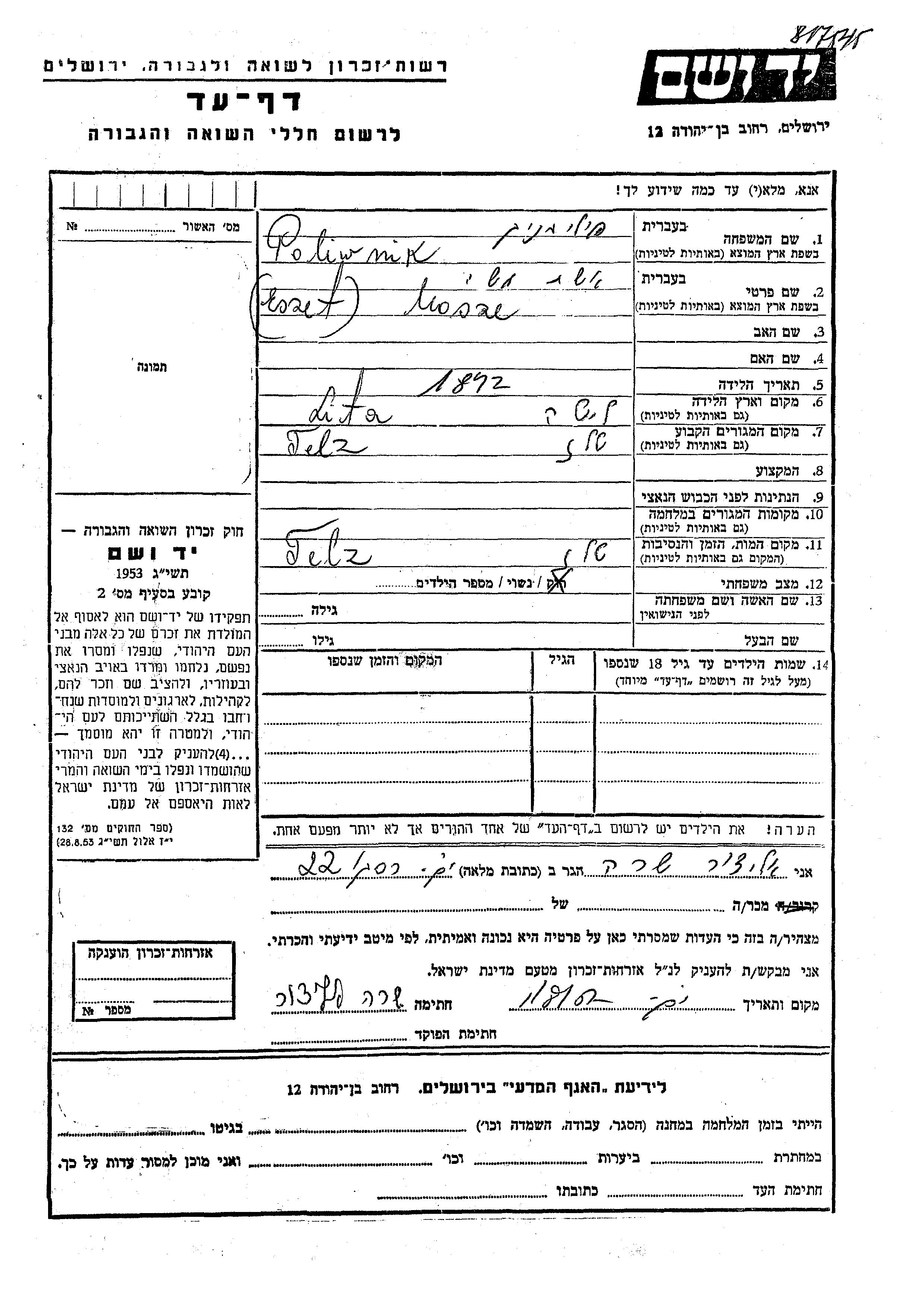 Vorname unbekannt Polimnik wurde im Jahr 1892 in Litauen geboren. Sie war mit Mosze Verheiratet. Vor dem Zweiten Weltkrieg lebte sie in Telz, Litauen.