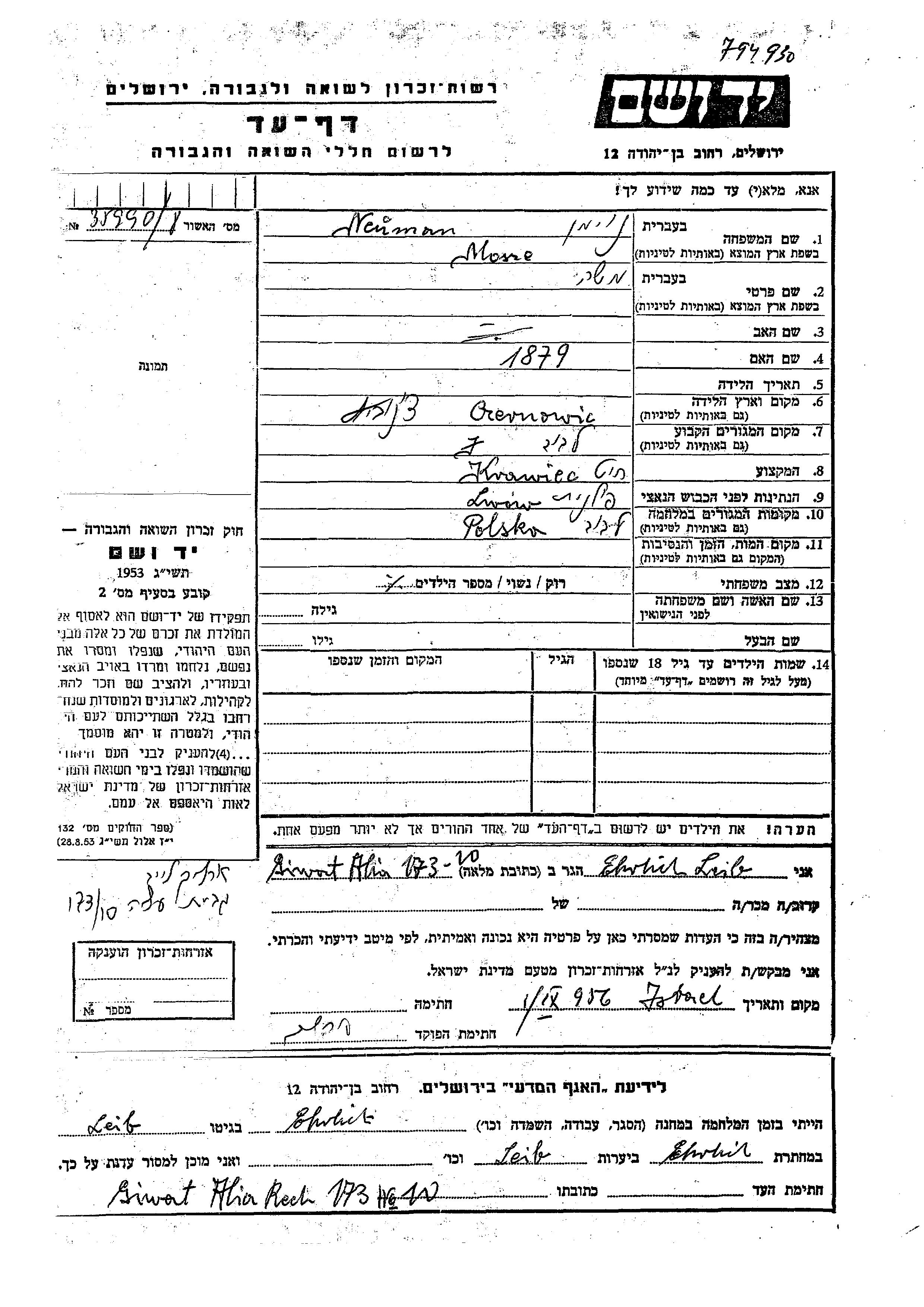 Mosze Neuman wurde im Jahr 1879 in Czernowitz, Rumänien geboren. Er war Schneider. Vor dem Zweiten Weltkrieg lebte er in Lwow, Polen. Während des Krieges war er in Lwow, Polen.