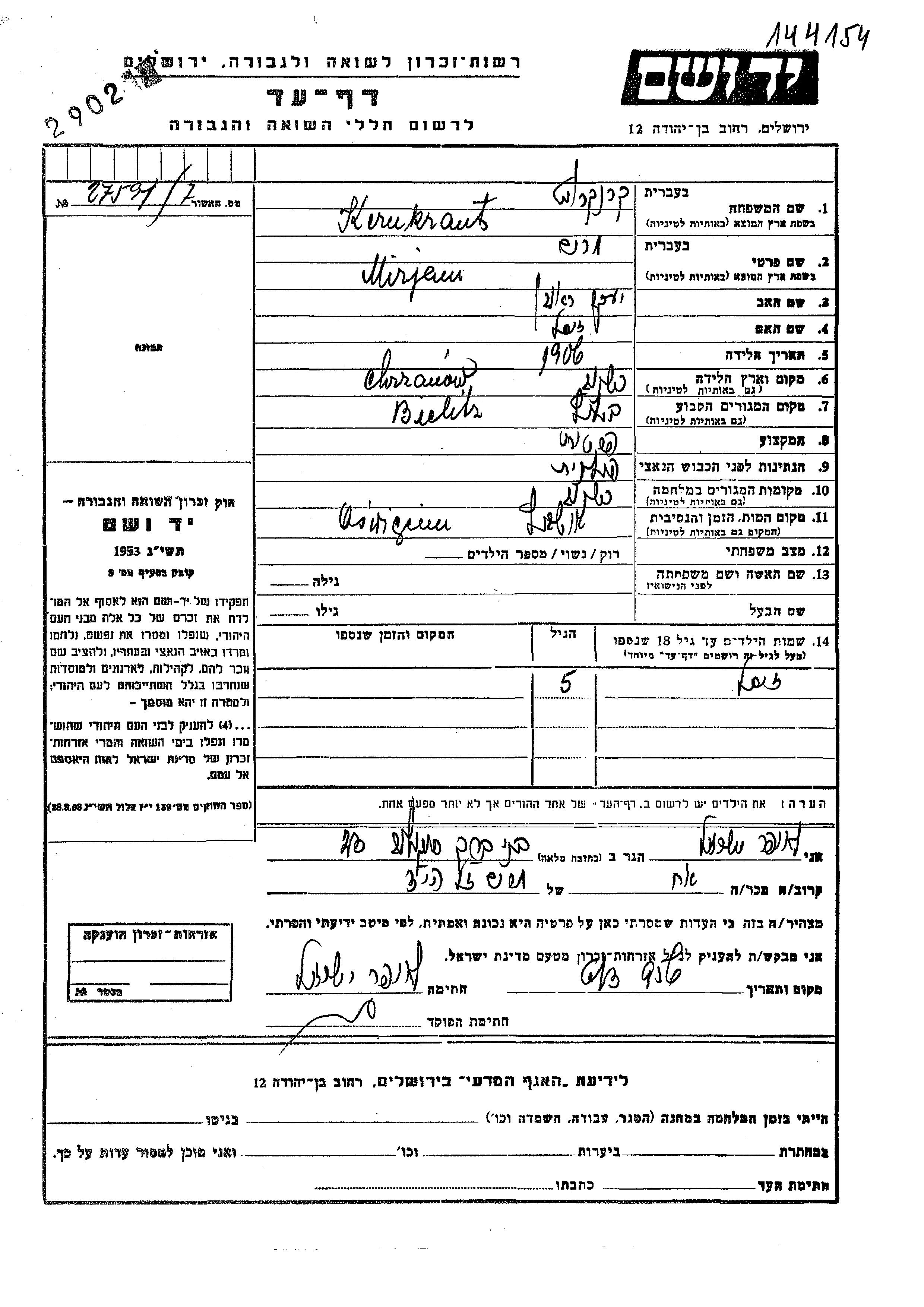 Mirjem Kernkraut wurde im Jahr 1906 in Chrzanow, Polen geboren. Sie war die Tochter von Yaakov Reuven und Zysl. Sie war Selbständig. Vor dem Zweiten Weltkrieg lebte sie in Bielitz, Polen. Während des Krieges war sie in Chrzanow, Polen.