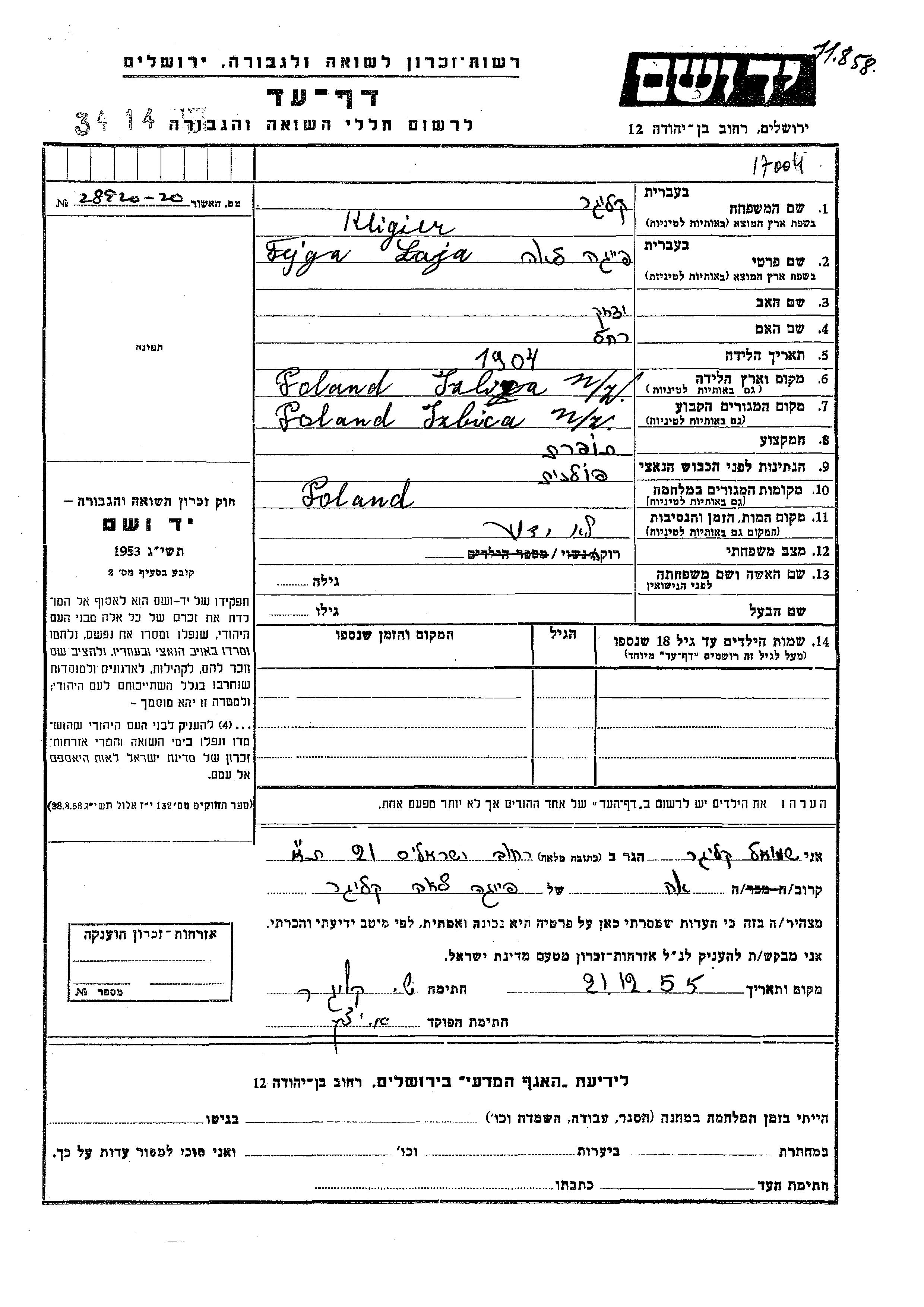 Fajga Laja Kligier wurde im Jahr 1904 in Izbica nad Wieprzem, Polen geboren. Sie war die Tochter von Yitzkhak und Rakhel. Sie war Schneiderin und Ledig. Vor dem Zweiten Weltkrieg lebte sie in Izbica nad Wieprzem, Polen. Während des Krieges war sie in Polen.