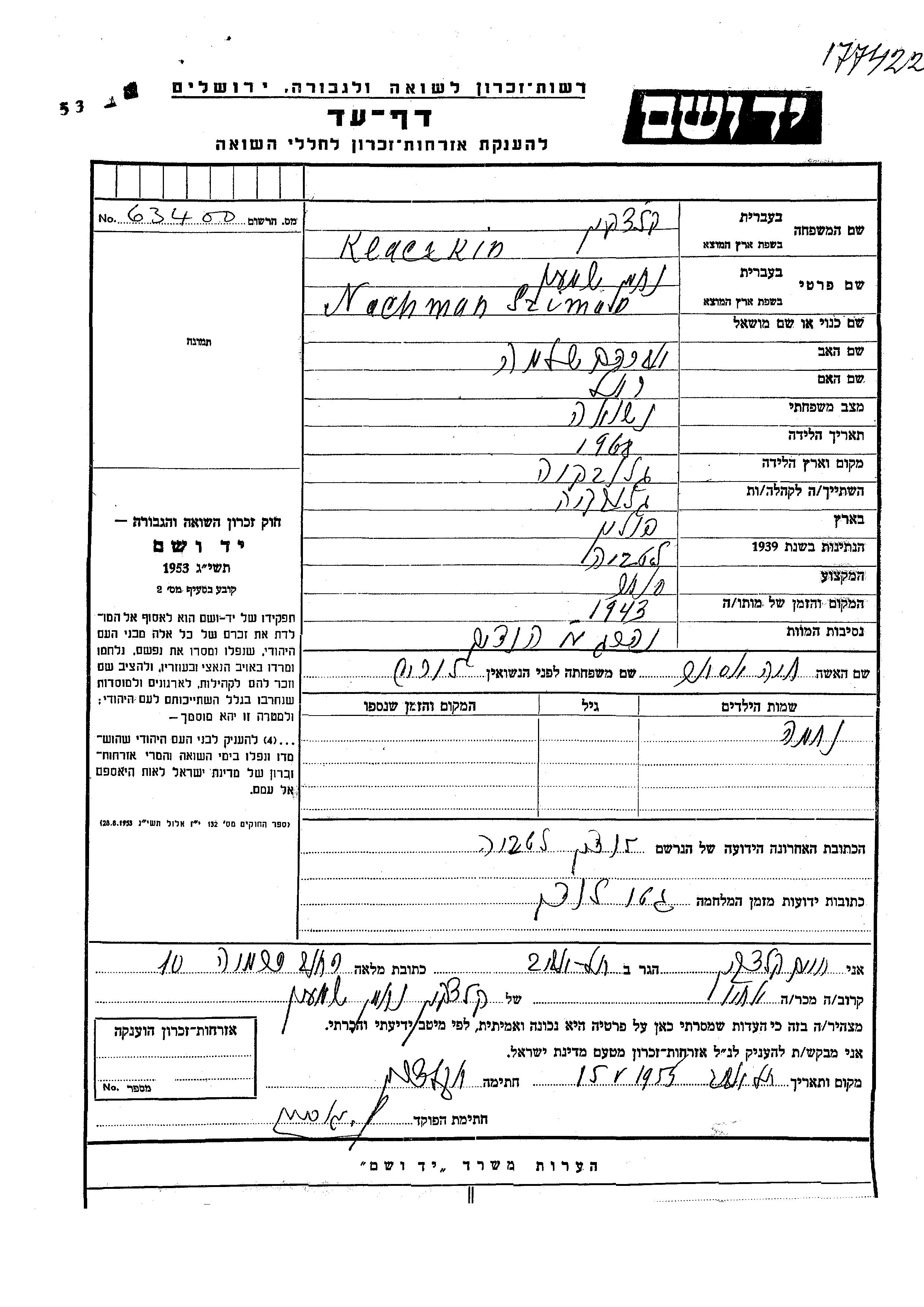 Nachman Szimon wurde in der Schoah ermordet. Todesort: unbekannt im Jahr 1943.