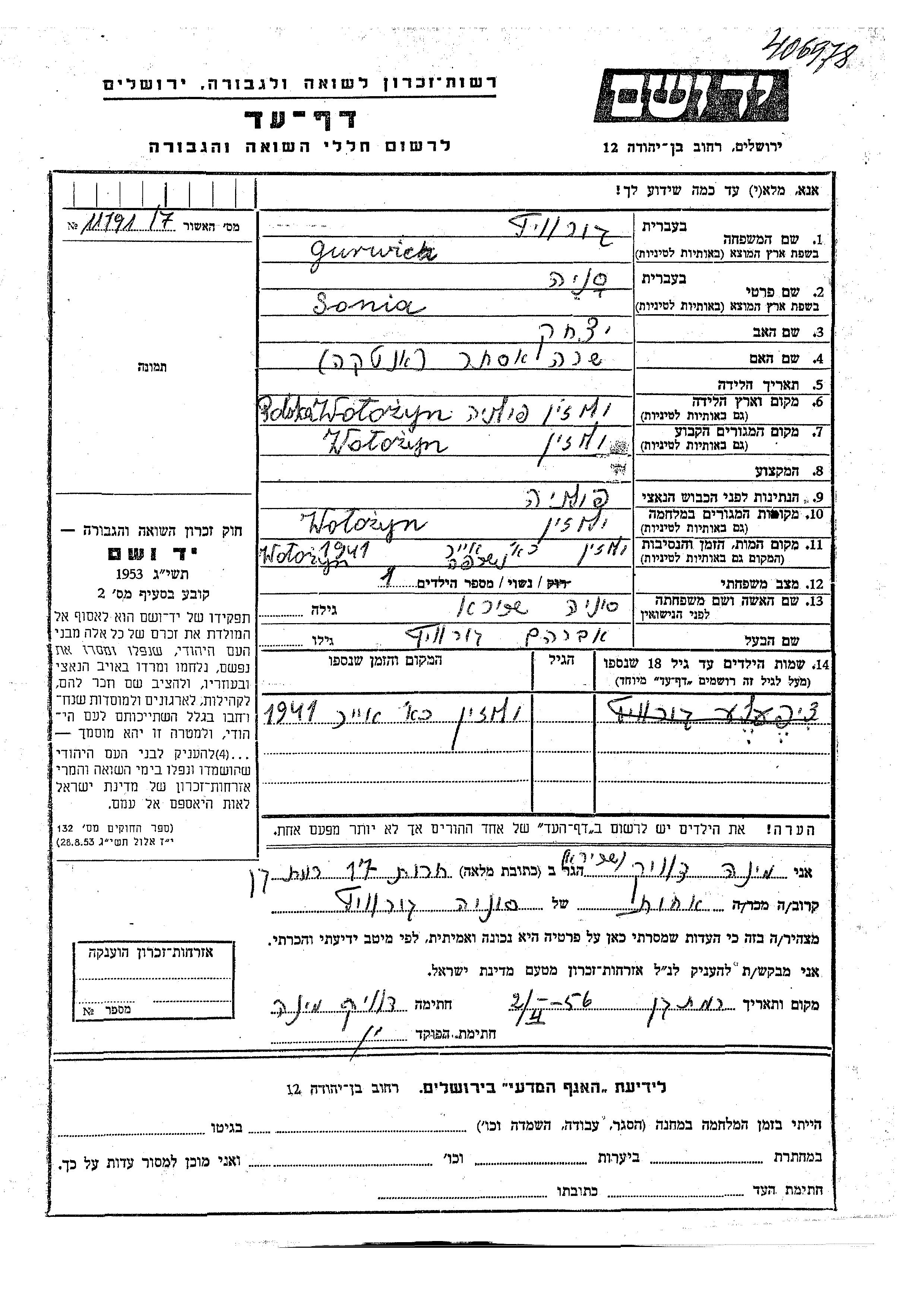 Gurwicz Sonia Senia Wolozyn, Polen Gedenkblatt