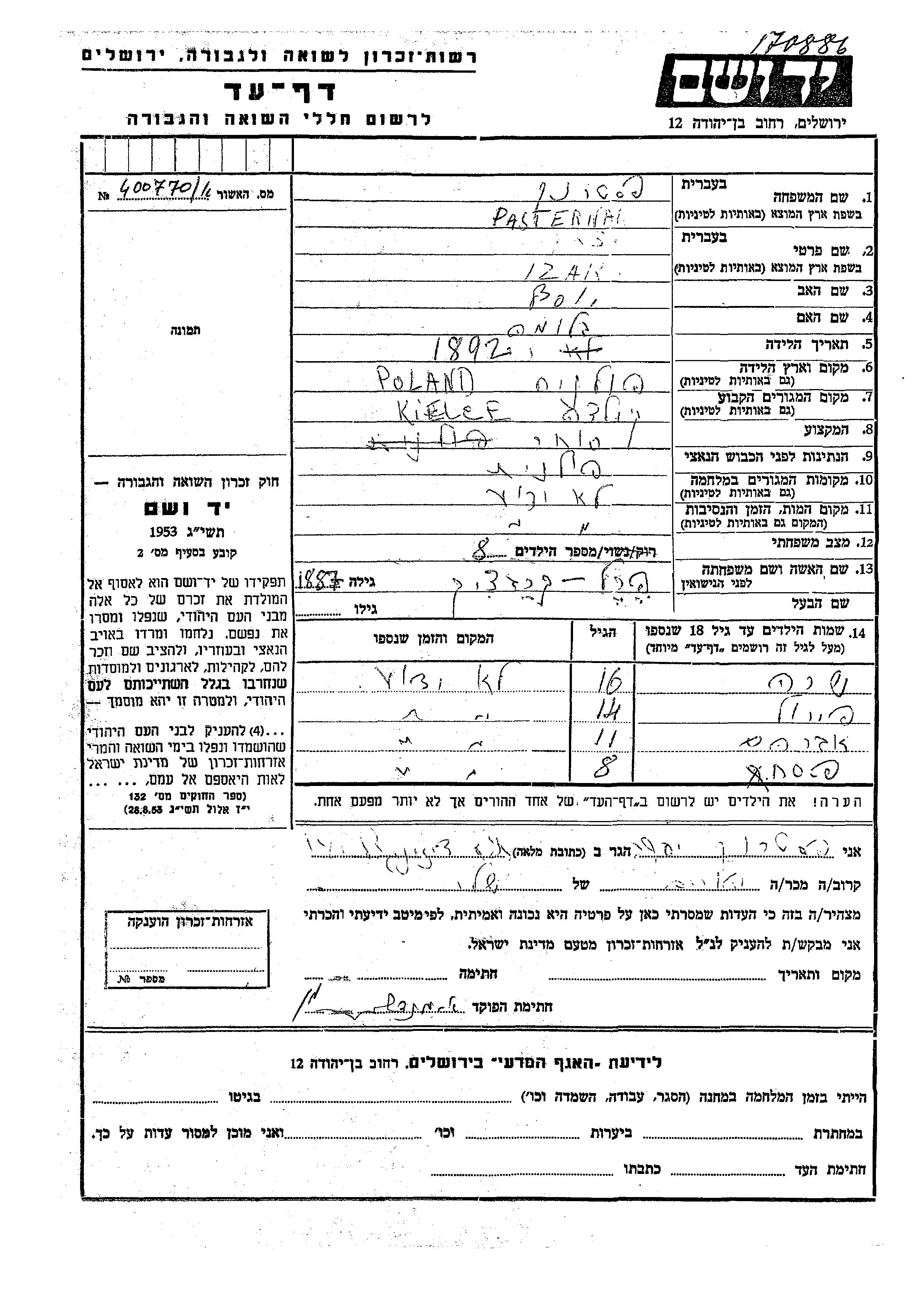 Izak Pasternak wurde im Jahr 1892 in Polen geboren. Er war der Sohn von Yosef und Bluma. Er war Kaufmann/-frau und mit Perel, geb. Kravchik Verheiratet. Vor dem Zweiten Weltkrieg lebte er in Kielce, Polen.