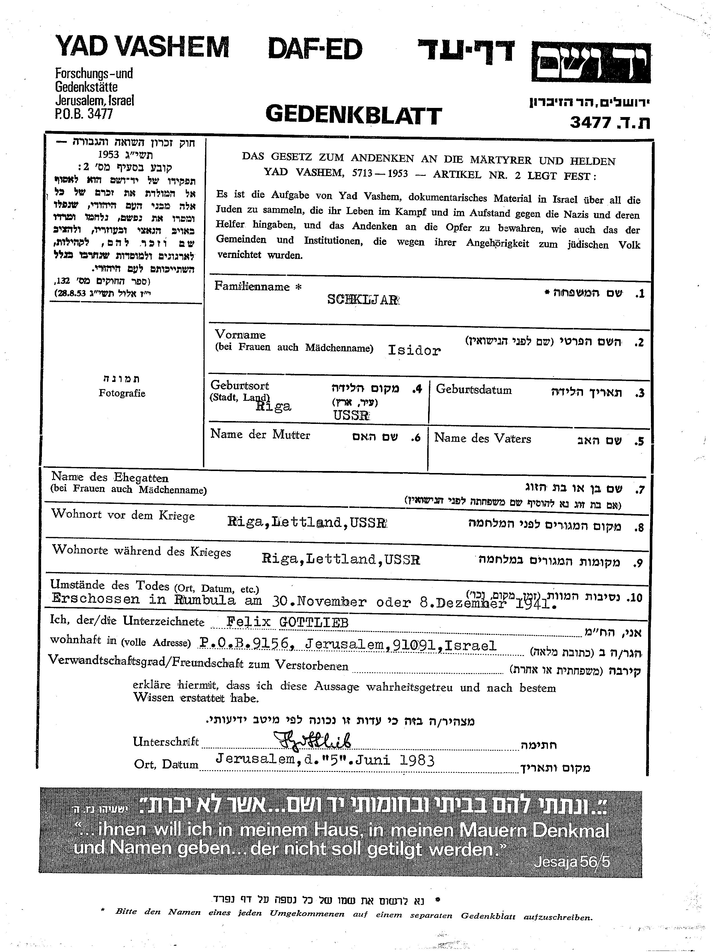 Isidor wurde in der Schoah ermordet. Todesort: Rumbula, Lettland im Jahr 08/12/1941.