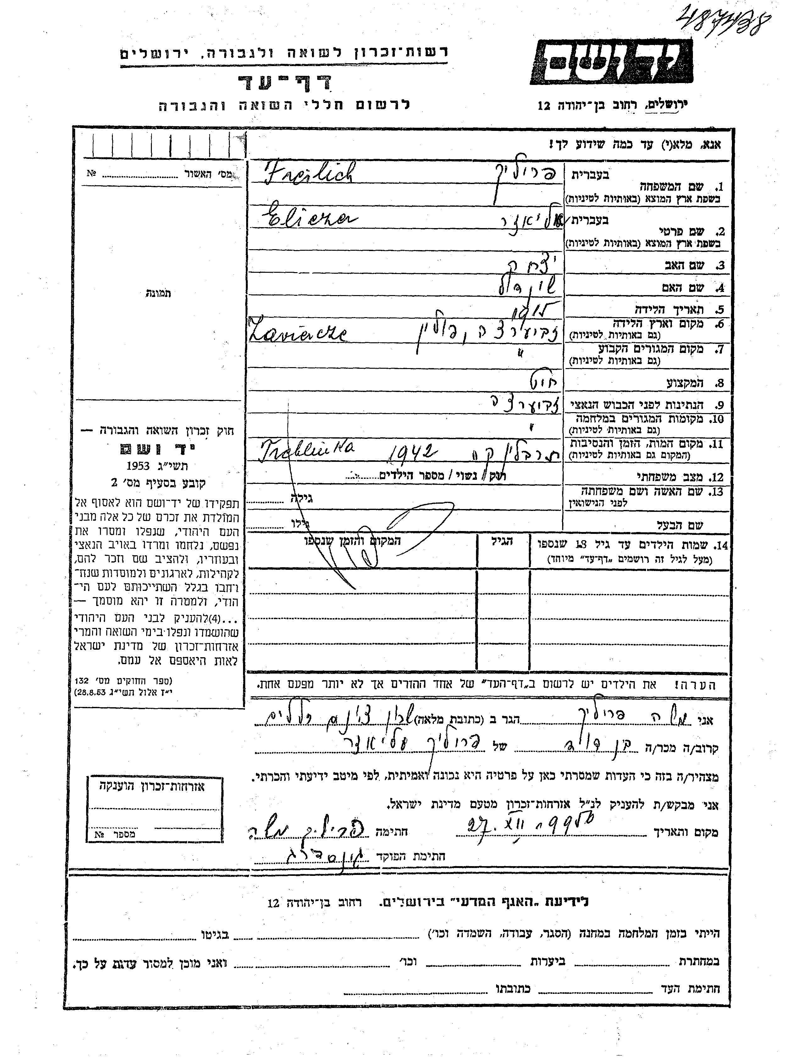 Freilich Eliezer 1915 Zaviercie, Polen Gedenkblatt