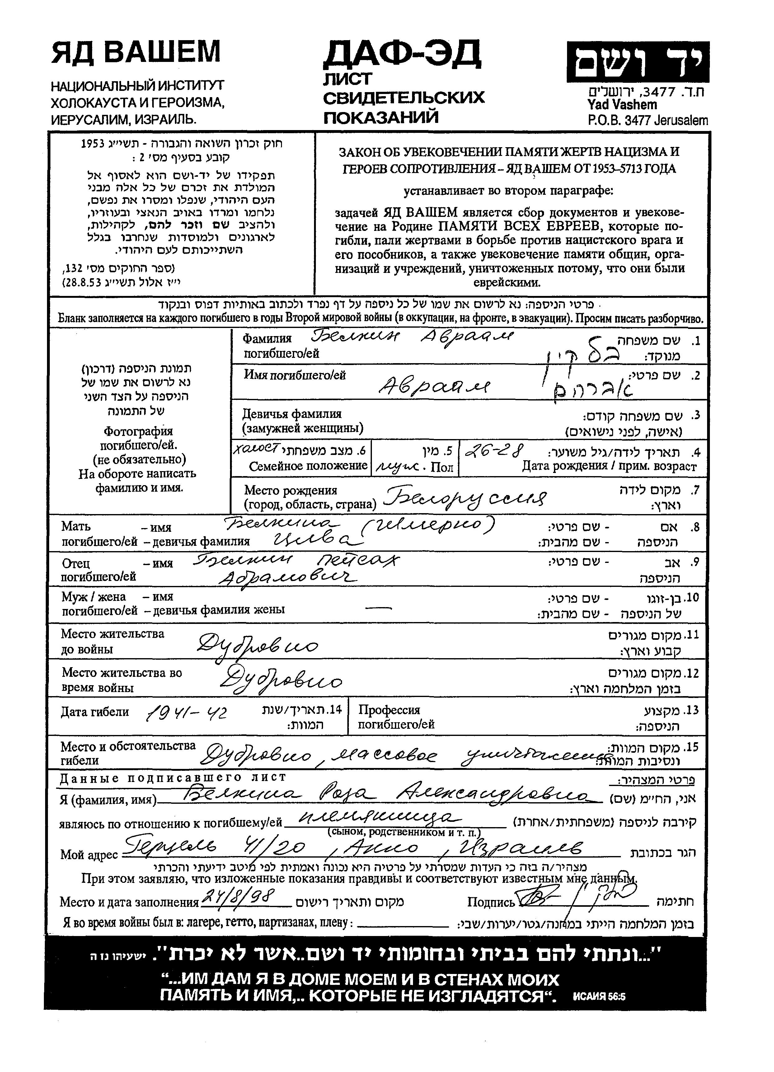 Avraam wurde in der Schoah ermordet. Todesort: Dubrovno, Weißrussland (UdSSR) im Jahr 1941.