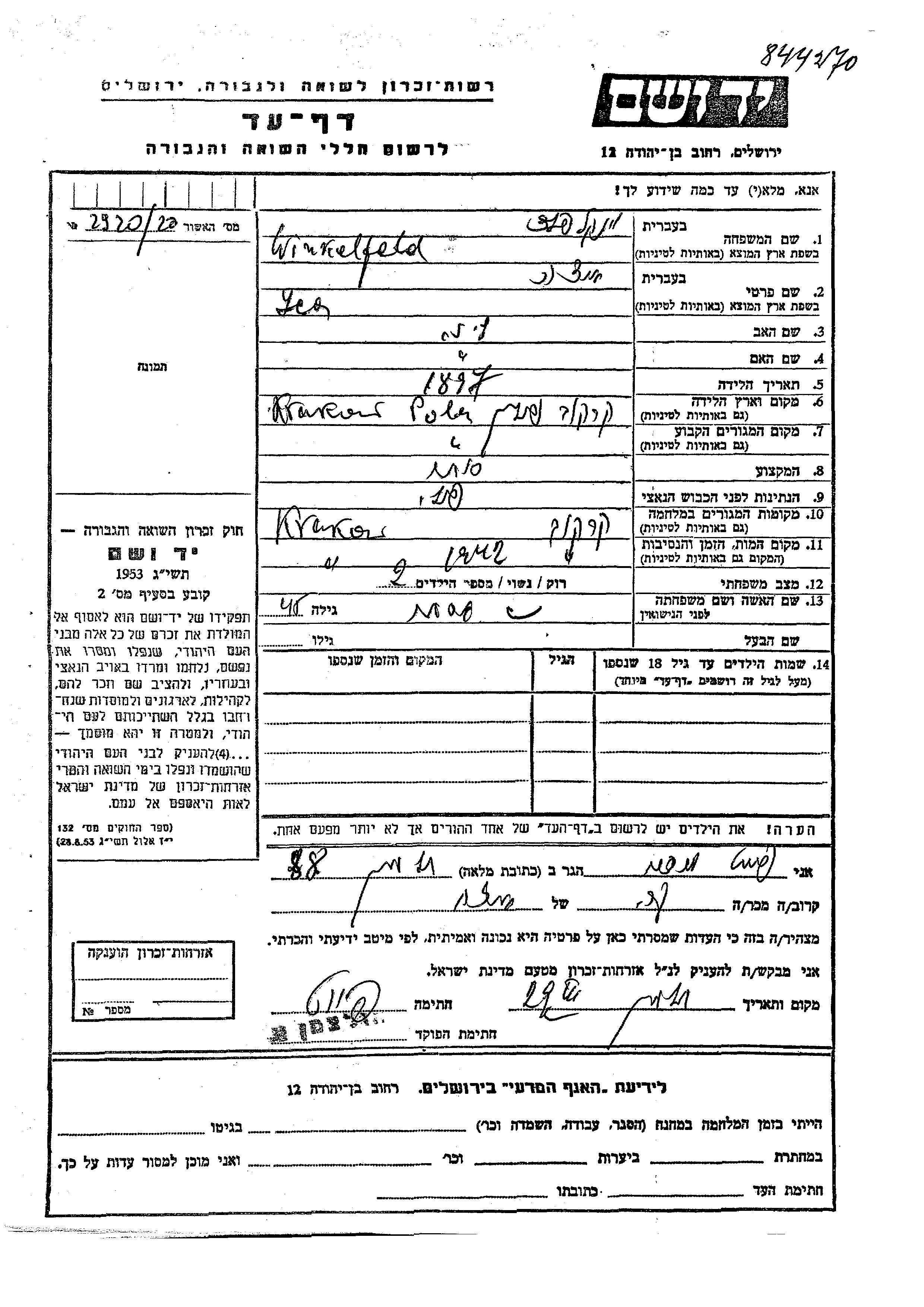 Yca Winkelfeld wurde im Jahr 1897 in Krakow, Polen geboren. Er war der Sohn von Liber. Er war Kaufmann/-frau und mit Ester Verheiratet. Vor dem Zweiten Weltkrieg lebte er in Krakow, Polen. Während des Krieges war er in Krakow, Polen.