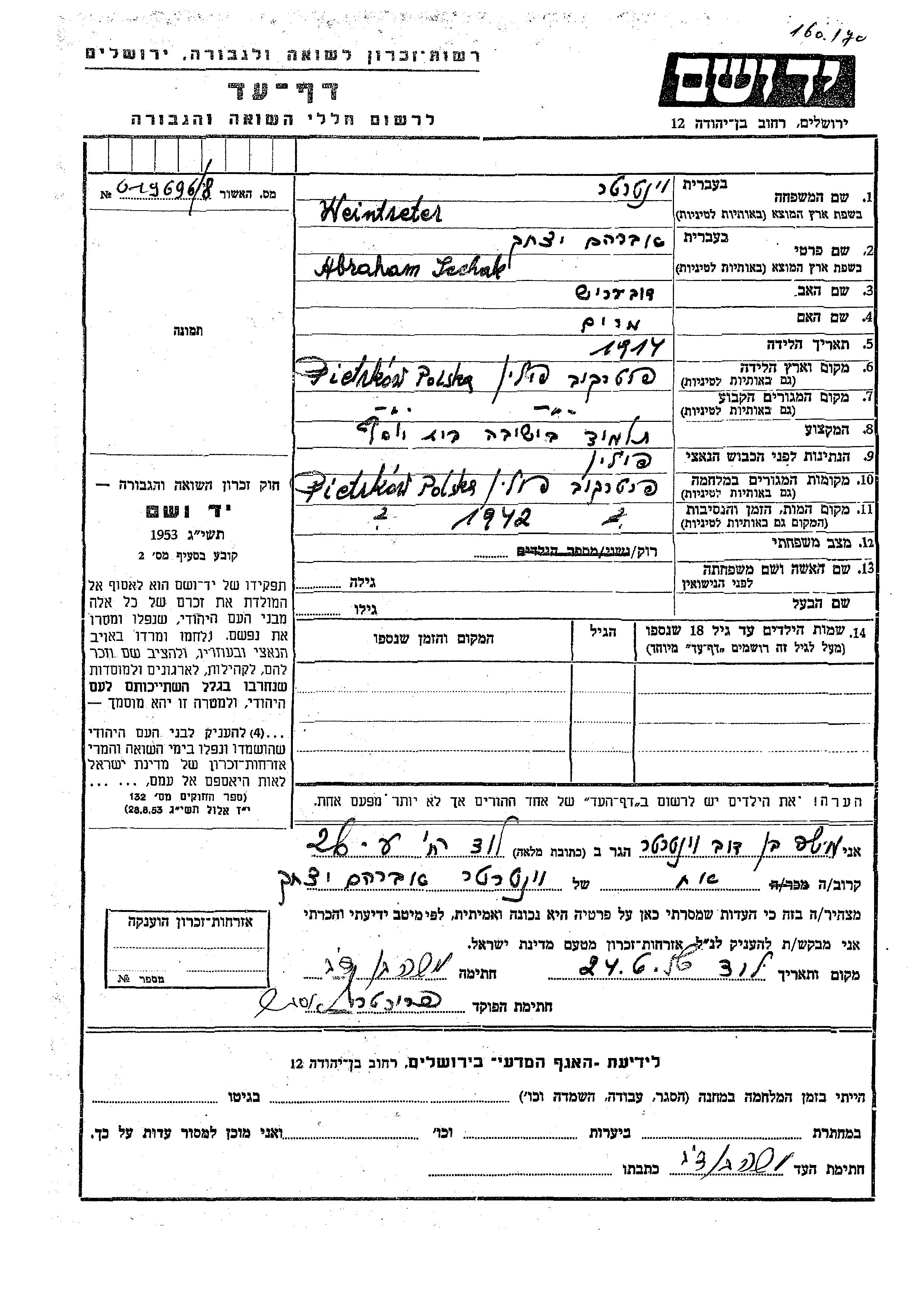 Abraham Icchak Weintreter wurde im Jahr 1914 in Piotrkow, Polen geboren. Er war der Sohn von Dov Erish und Miriam. Er war Jeschiwahschüler und Ledig. Vor dem Zweiten Weltkrieg lebte er in Piotrkow, Polen. Während des Krieges war er in Piotrkow, Polen.