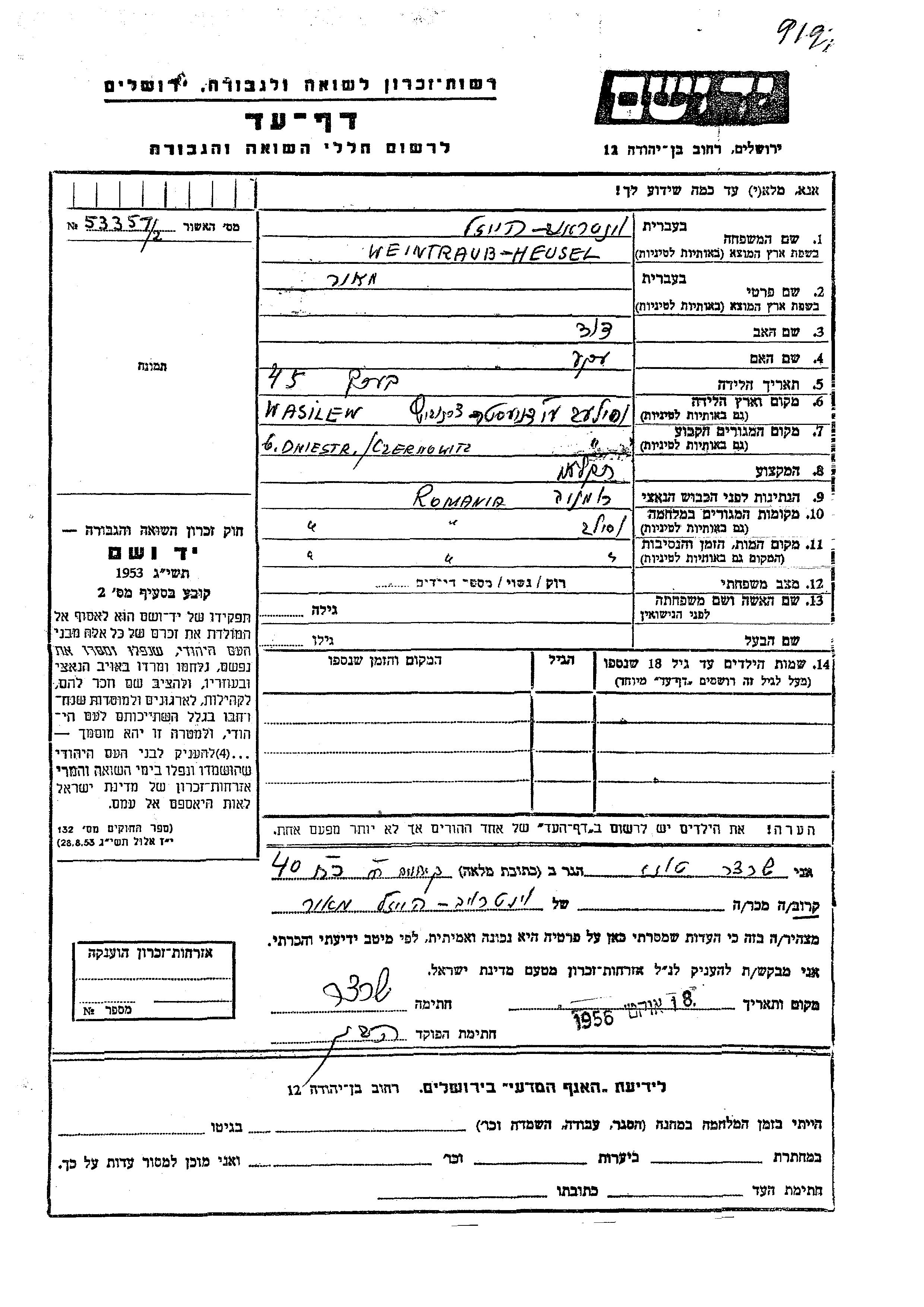 Weintraub Heusel Meir Vasilau, Rumänien Gedenkblatt