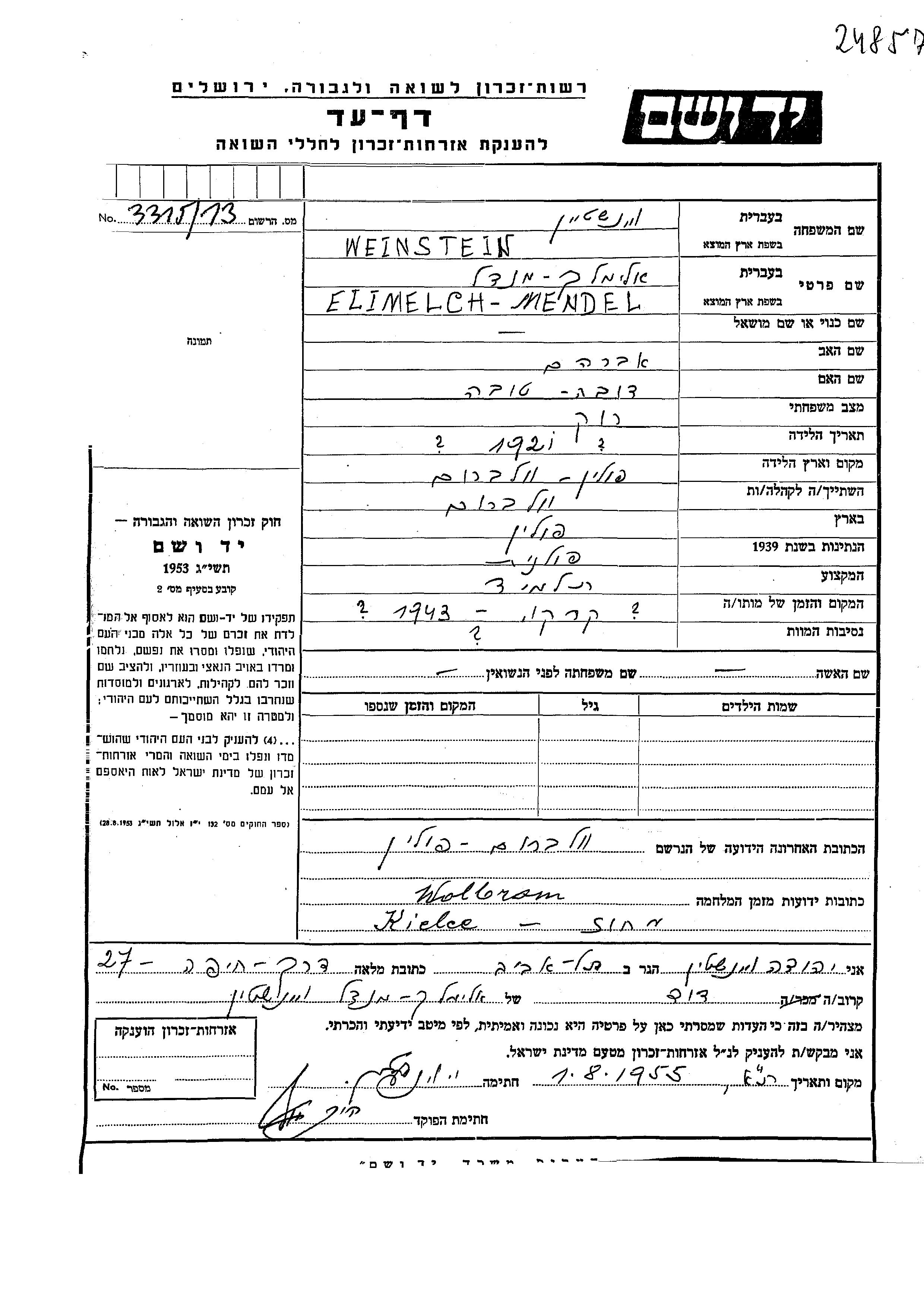 Elimelch Mendel Weinstein wurde im Jahr 1921 in Wolbrom, Polen geboren. Er war der Sohn von Avraham und Doba Tova. Er war Schüler/-in. Vor dem Zweiten Weltkrieg lebte er in Wolbrom, Polen. Während des Krieges war er in Wolbrom, Polen.