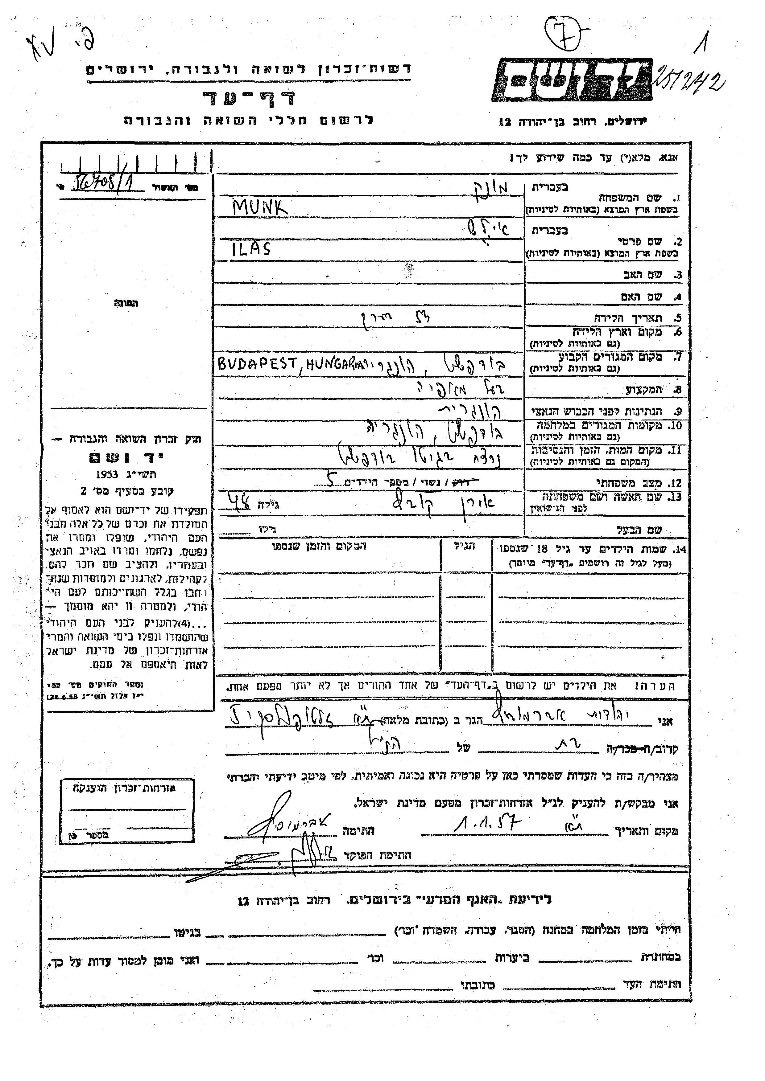 Ilas Munk. Er war Bäcker/-in und mit Iren, geb. Kovach Verheiratet. Vor dem Zweiten Weltkrieg lebte er in Budapest, Ungarn. Während des Krieges war er in Budapest, Ungarn.