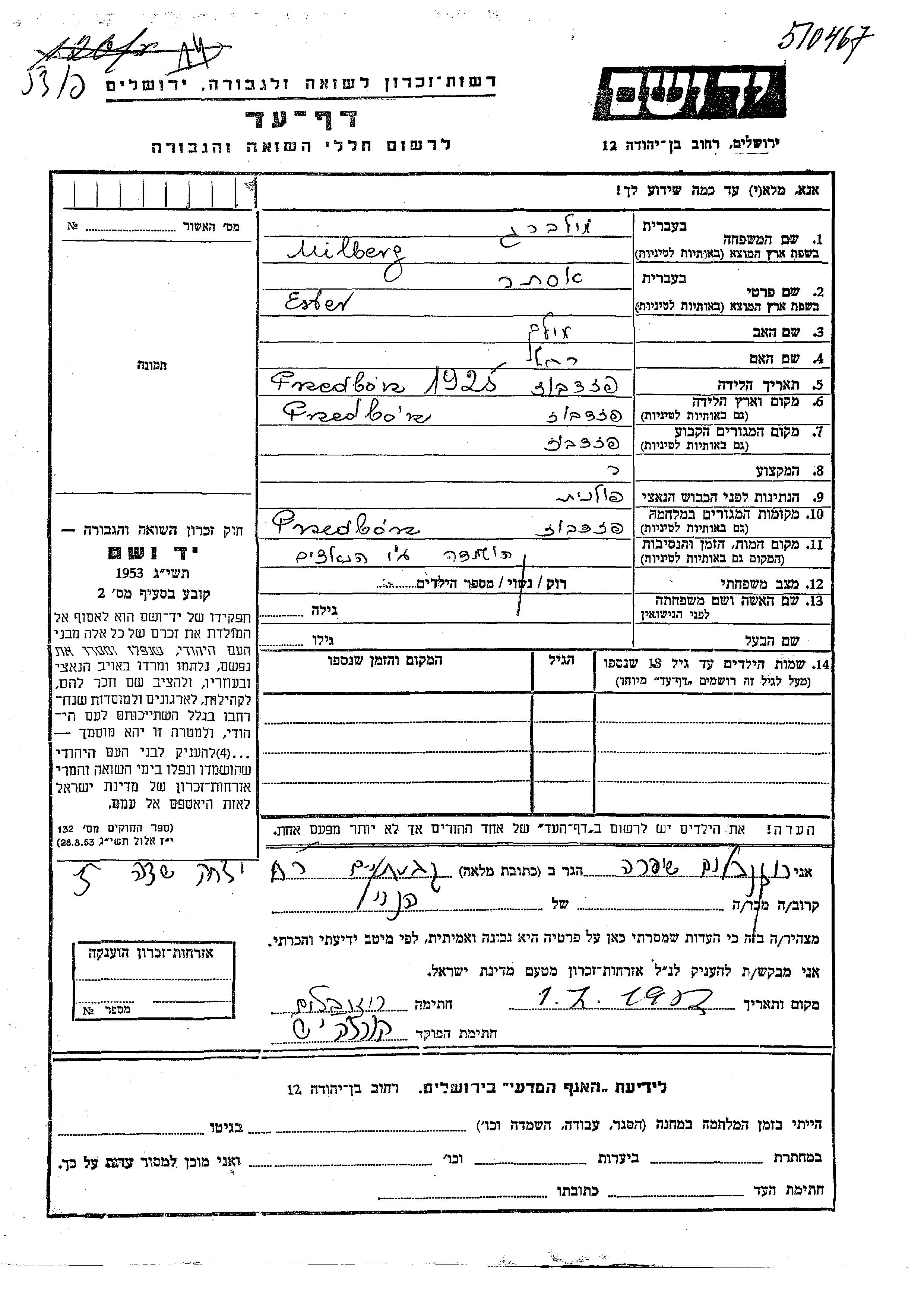 Ester Milberg wurde im Jahr 1925 in Przedborz, Polen geboren. Sie war die Tochter von Milek und Rakhel. Sie war Ledig. Vor dem Zweiten Weltkrieg lebte sie in Przedborz, Polen. Während des Krieges war sie in Przedborz, Polen.