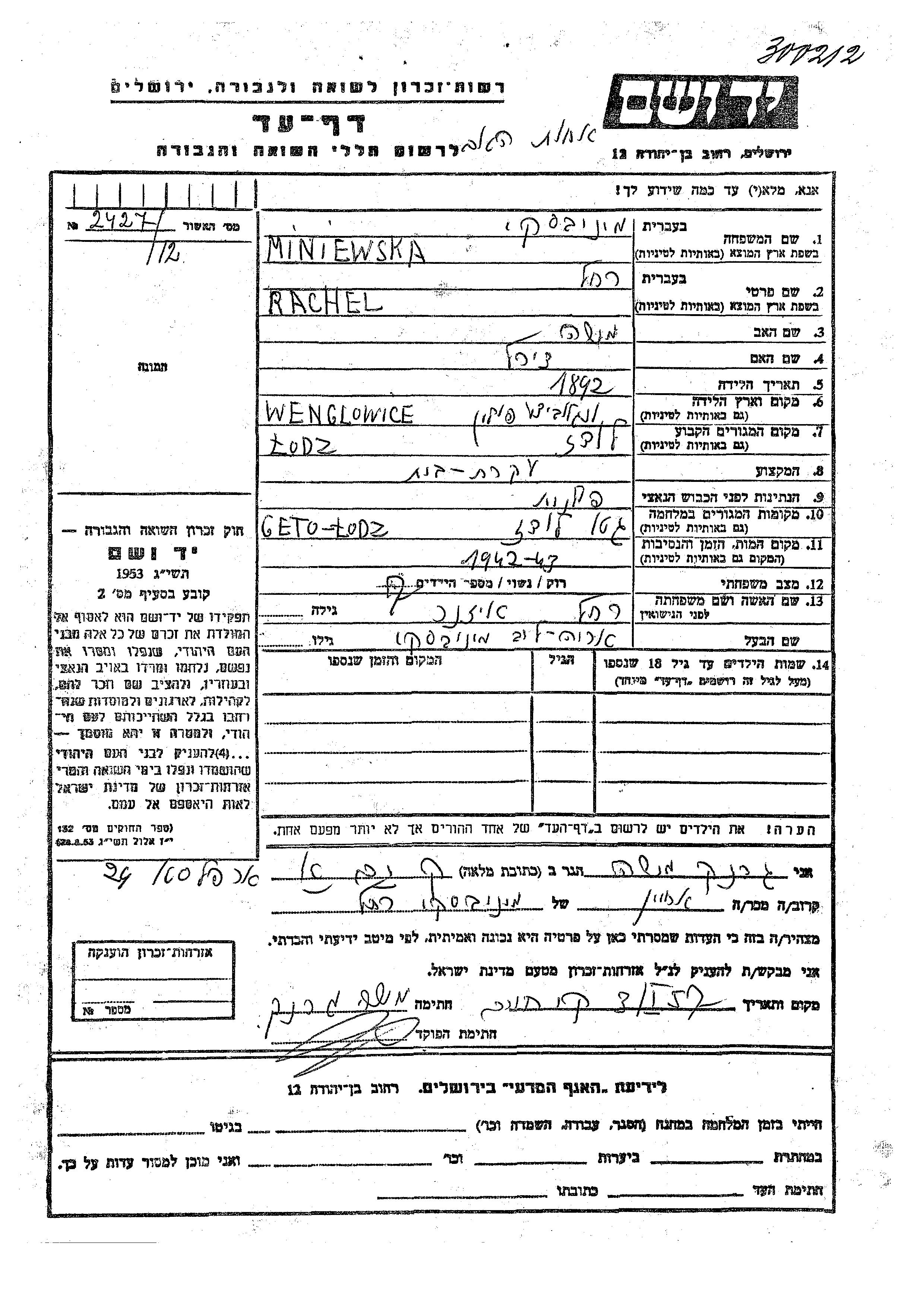 Rachel Miniewska, geb. Eizner wurde im Jahr 1892 in Weglowice, Polen geboren. Sie war die Tochter von Moshe und Tzirel. Sie war Hausfrau und mit Arie Leib Verheiratet. Vor dem Zweiten Weltkrieg lebte sie in Lodz, Polen. Während des Krieges war sie in Lodz, Polen.