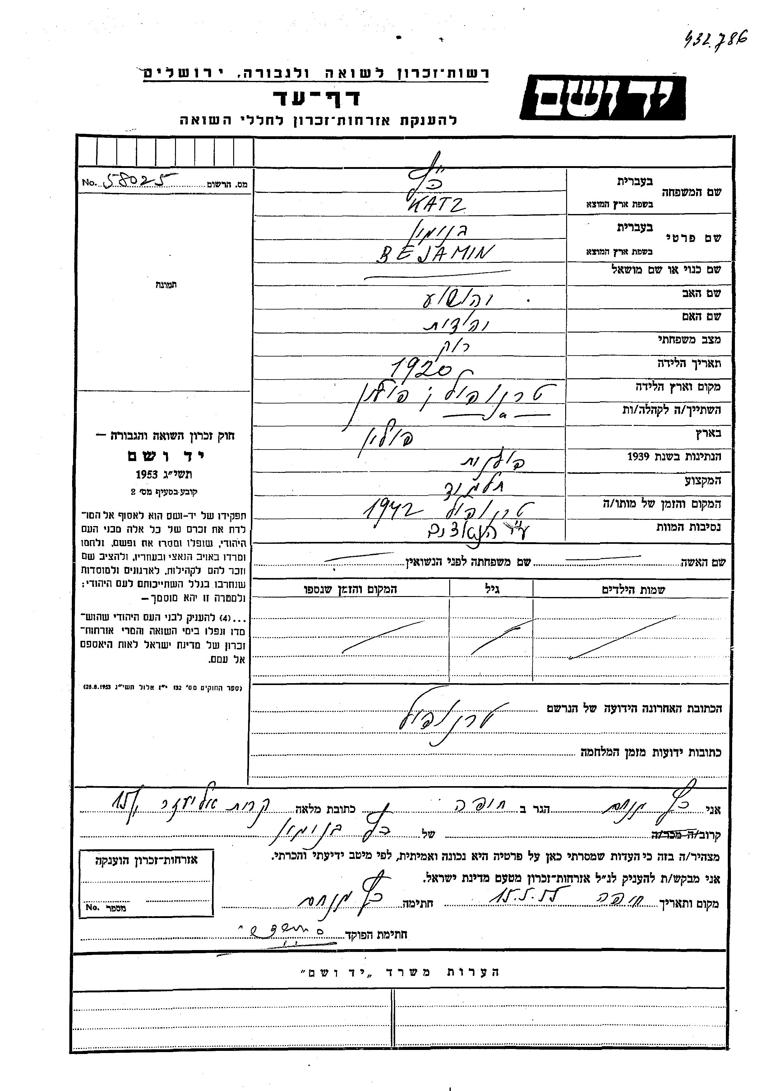 Bejamin Katz wurde im Jahr 1920 in Tarnopol, Polen geboren. Er war der Sohn von Yehoshua und Yehudit. Er war Schüler/-in und Ledig. Vor dem Zweiten Weltkrieg lebte er in Tarnopol, Polen.