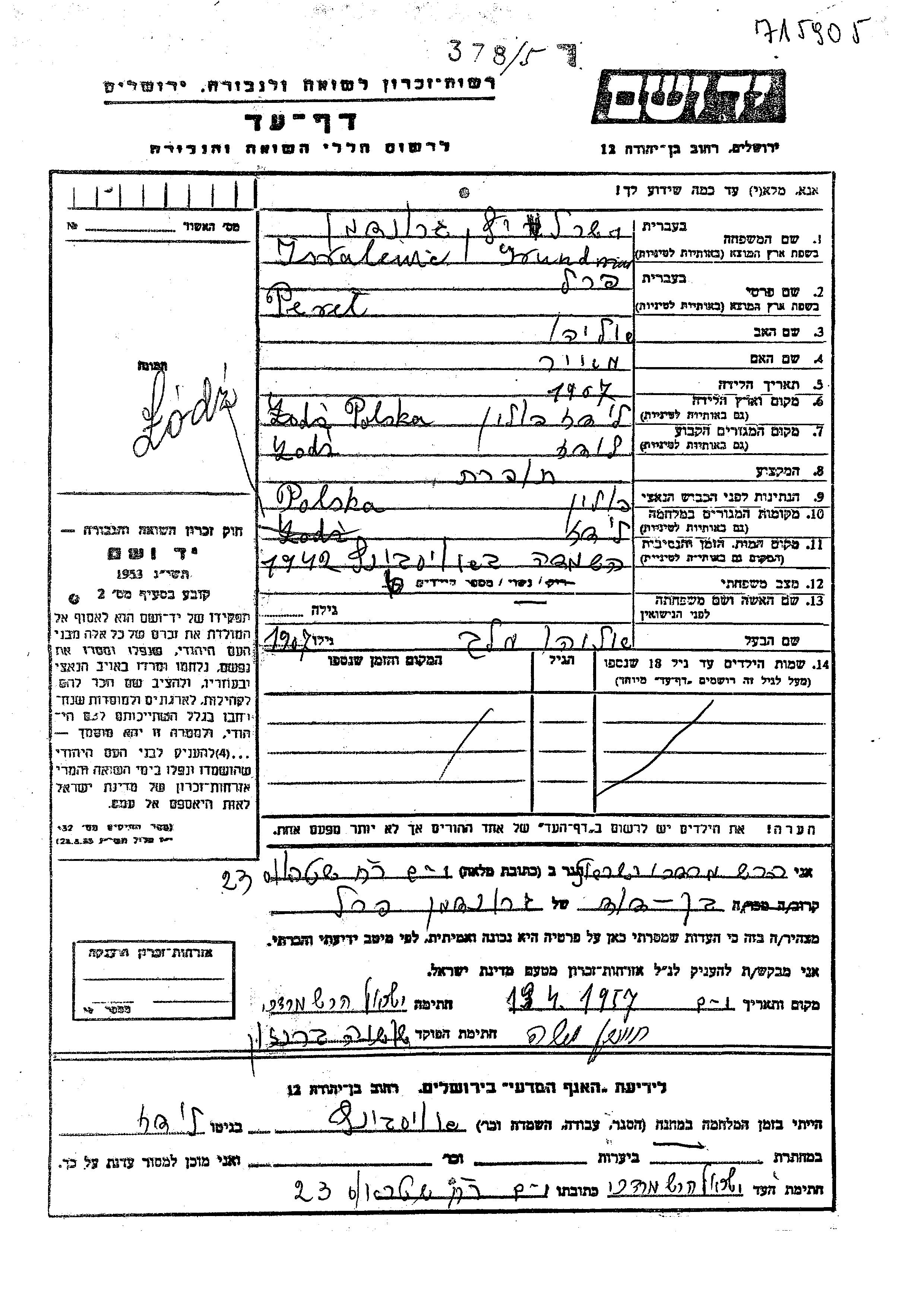 Perel Isralewicz, geb. Grundman wurde im Jahr 1907 in Lodz, Polen geboren. Sie war die Tochter von Eliahu und Meir. Sie war Schneiderin und mit Eliahu Melekh Verheiratet. Vor dem Zweiten Weltkrieg lebte sie in Lodz, Polen. Während des Krieges war sie in Lodz, Polen.