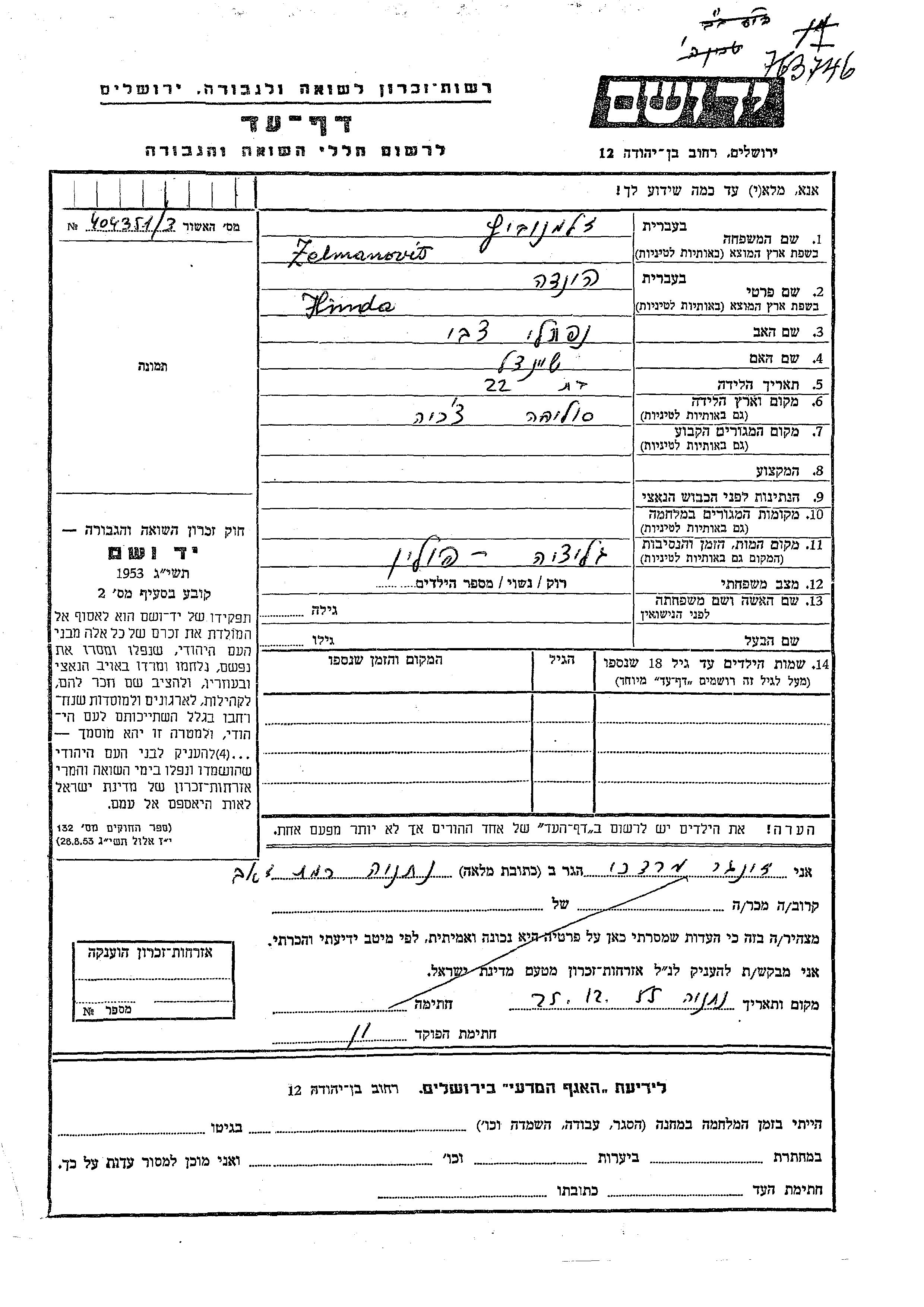 Zelmanovit Hinda unbekannter Ort, Gedenkblatt