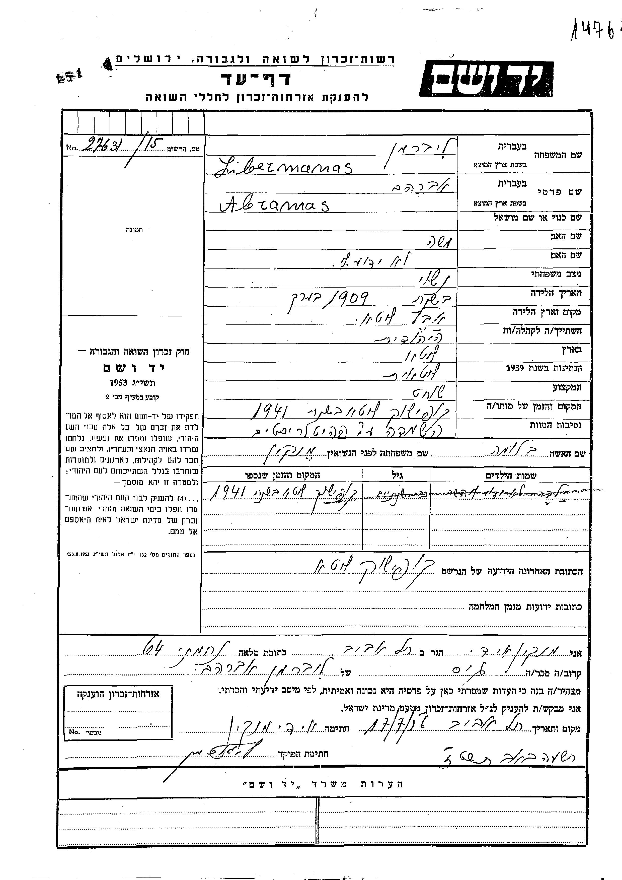 Abramas Libermanas wurde im Jahr 1909 in Obeliai, Litauen geboren. Er war der Sohn von Moshe. Er war Schächter und mit Bluma, geb. Menkin Verheiratet. Vor dem Zweiten Weltkrieg lebte er in Litauen.