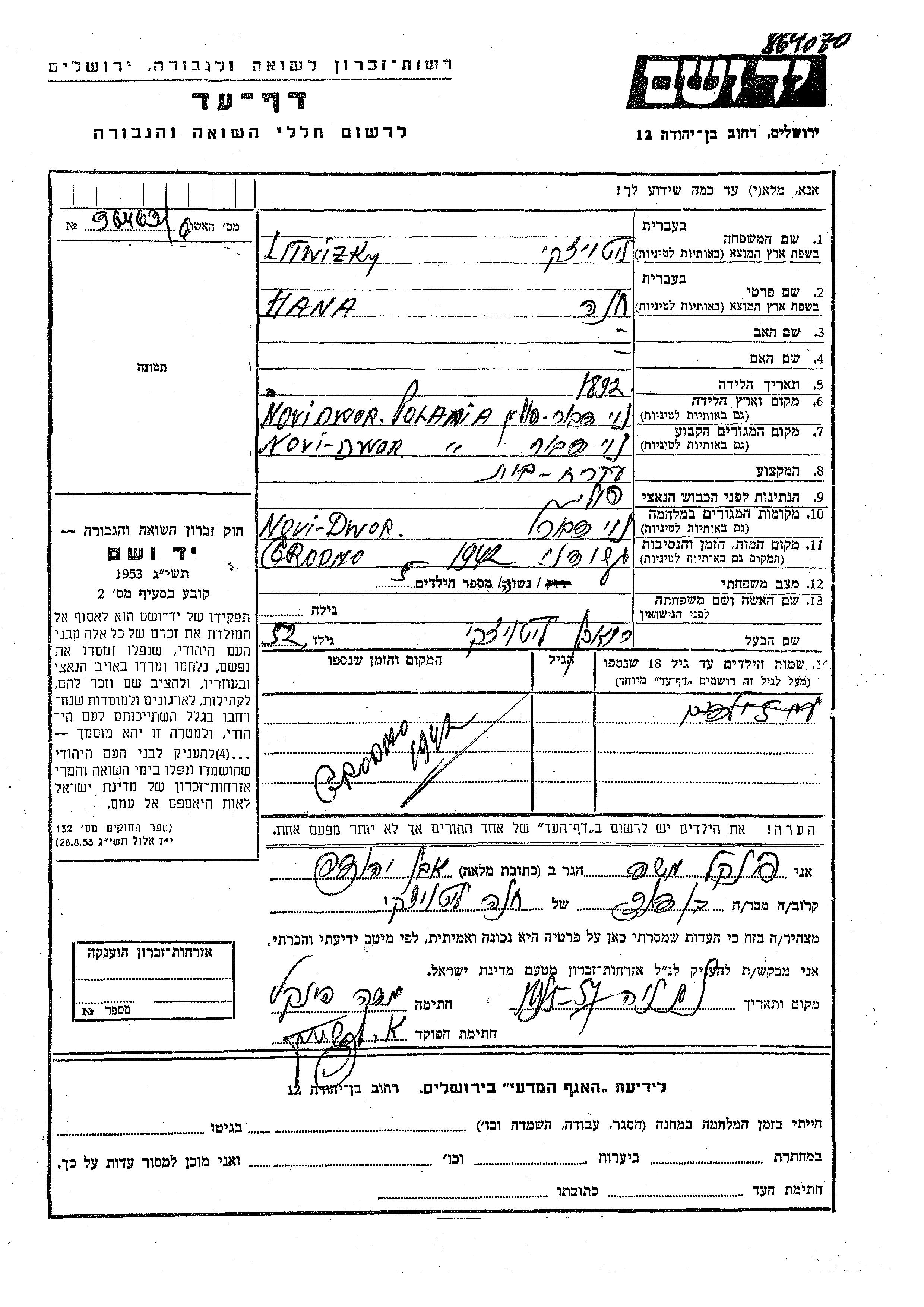 Hana Litwizky wurde im Jahr 1892 in Nowy Dwor, Polen geboren. Sie war Hausfrau und mit Reuven Verheiratet. Vor dem Zweiten Weltkrieg lebte sie in Nowy Dwor, Polen. Während des Krieges war sie in Nowy Dwor, Polen.
