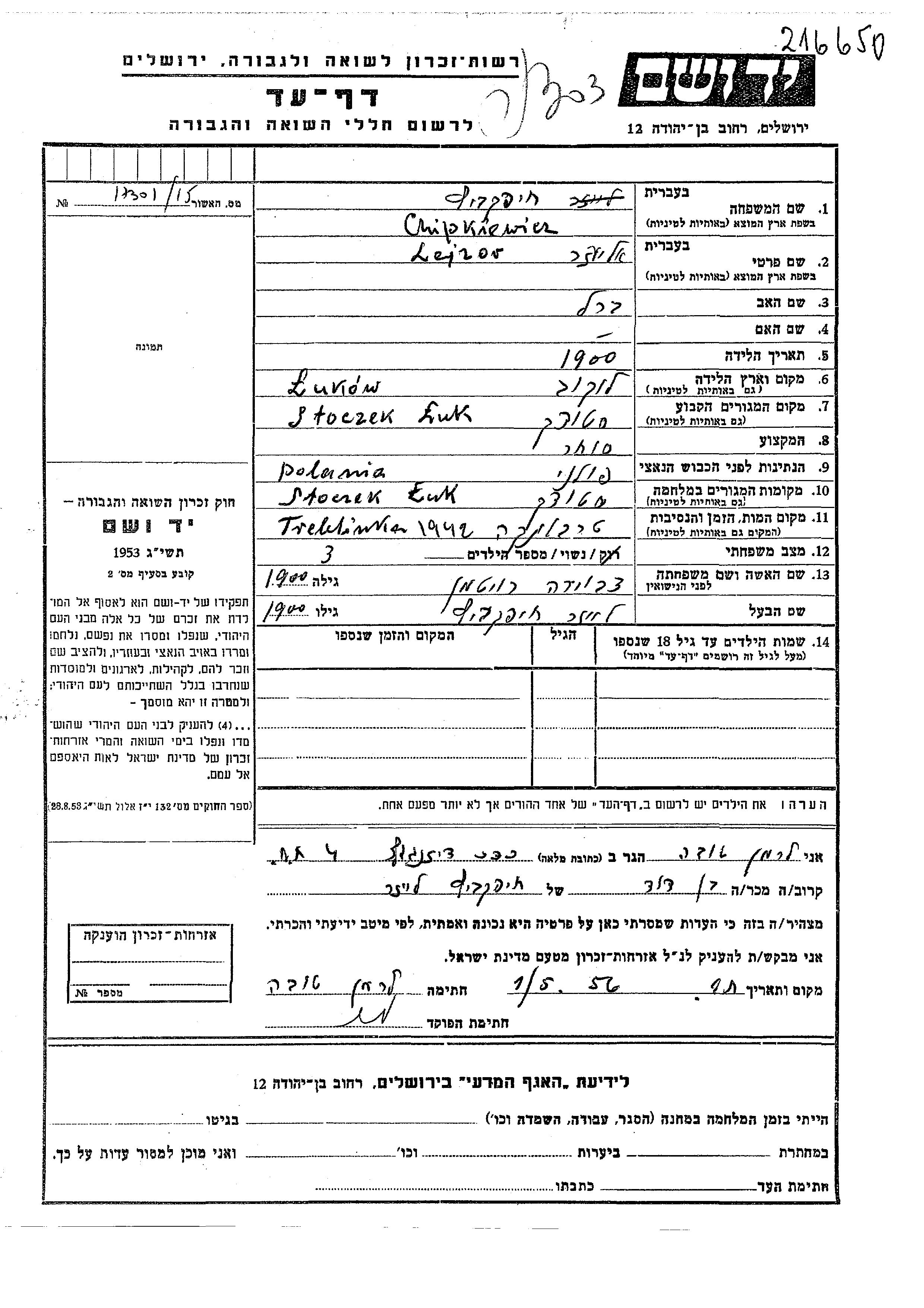 Leizor Chipkiewicz wurde im Jahr 1900 in Lukow, Polen geboren. Er war der Sohn von Berl. Er war Kaufmann/-frau und mit Dvora, geb. Roitman Verheiratet. Vor dem Zweiten Weltkrieg lebte er in Stoczek, Polen. Während des Krieges war er in Stoczek, Polen.