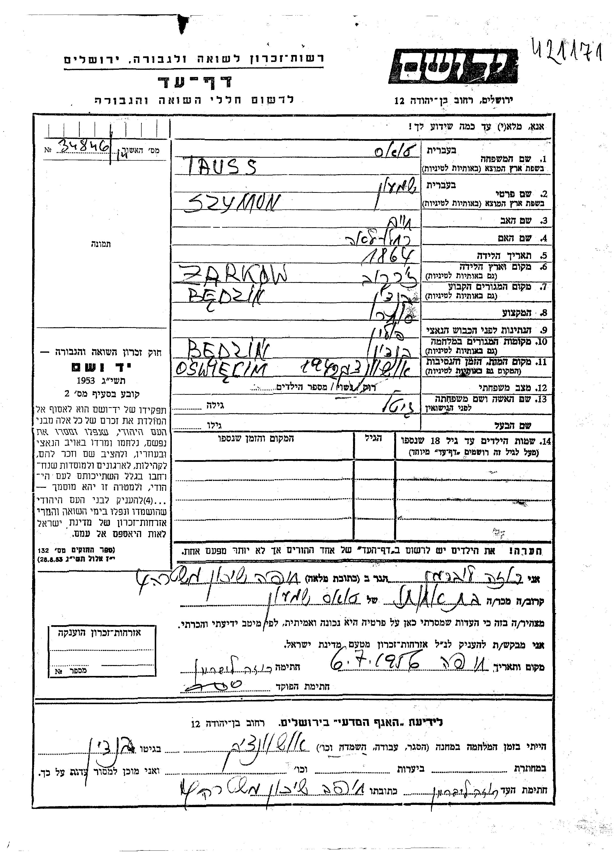 Szymon Tauss wurde im Jahr 1864 in Zarkow, Polen geboren. Er war der Sohn von Khaim und Rakhel Lea. Er war Kaufmann/-frau und mit Gitel Verheiratet. Vor dem Zweiten Weltkrieg lebte er in Będzin, Polen. Während des Krieges war er in Będzin, Polen.