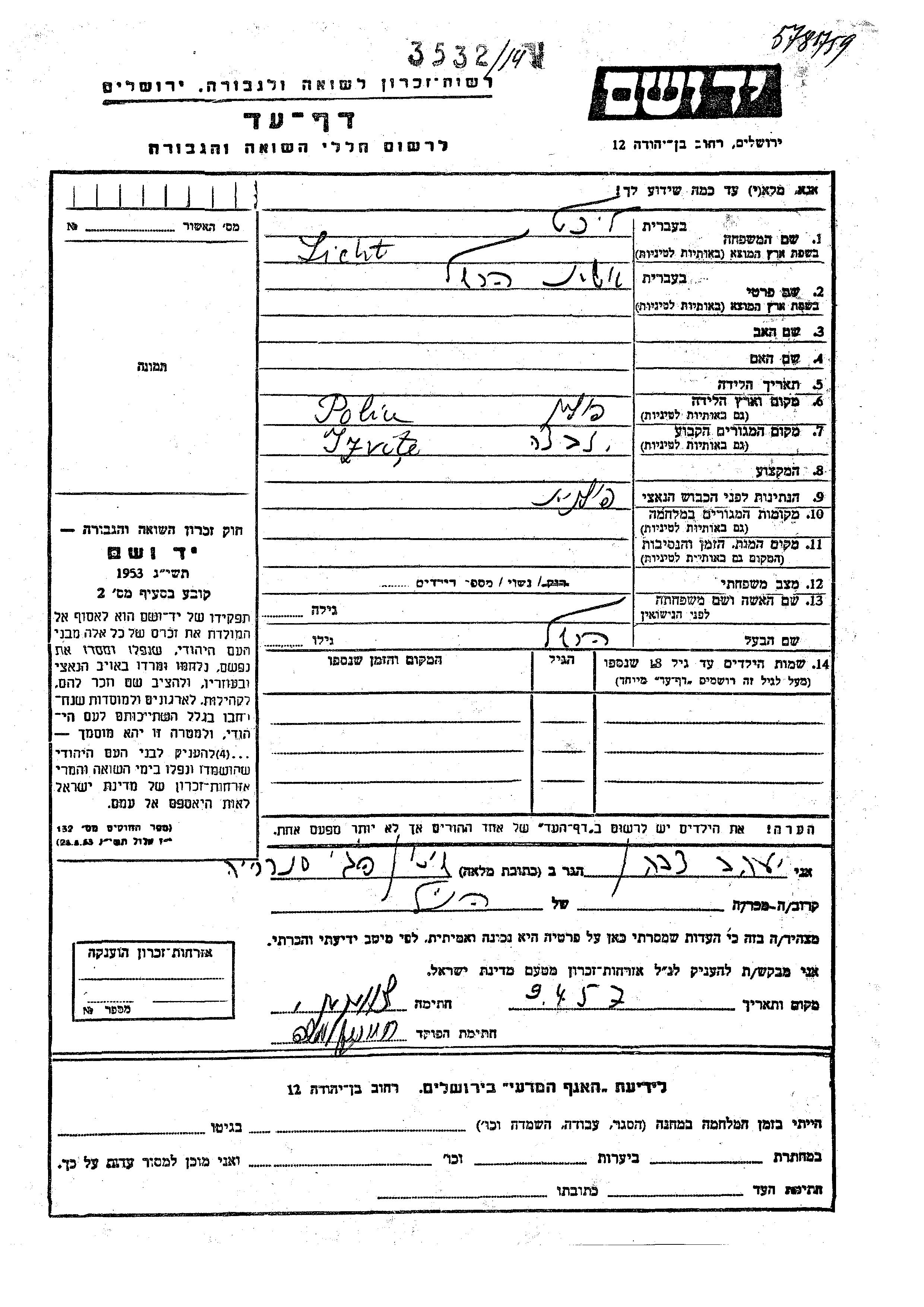 Vorname unbekannt Licht wurde in Polen geboren. Sie war mit Hershel Verheiratet. Vor dem Zweiten Weltkrieg lebte sie in Izbica, Polen.