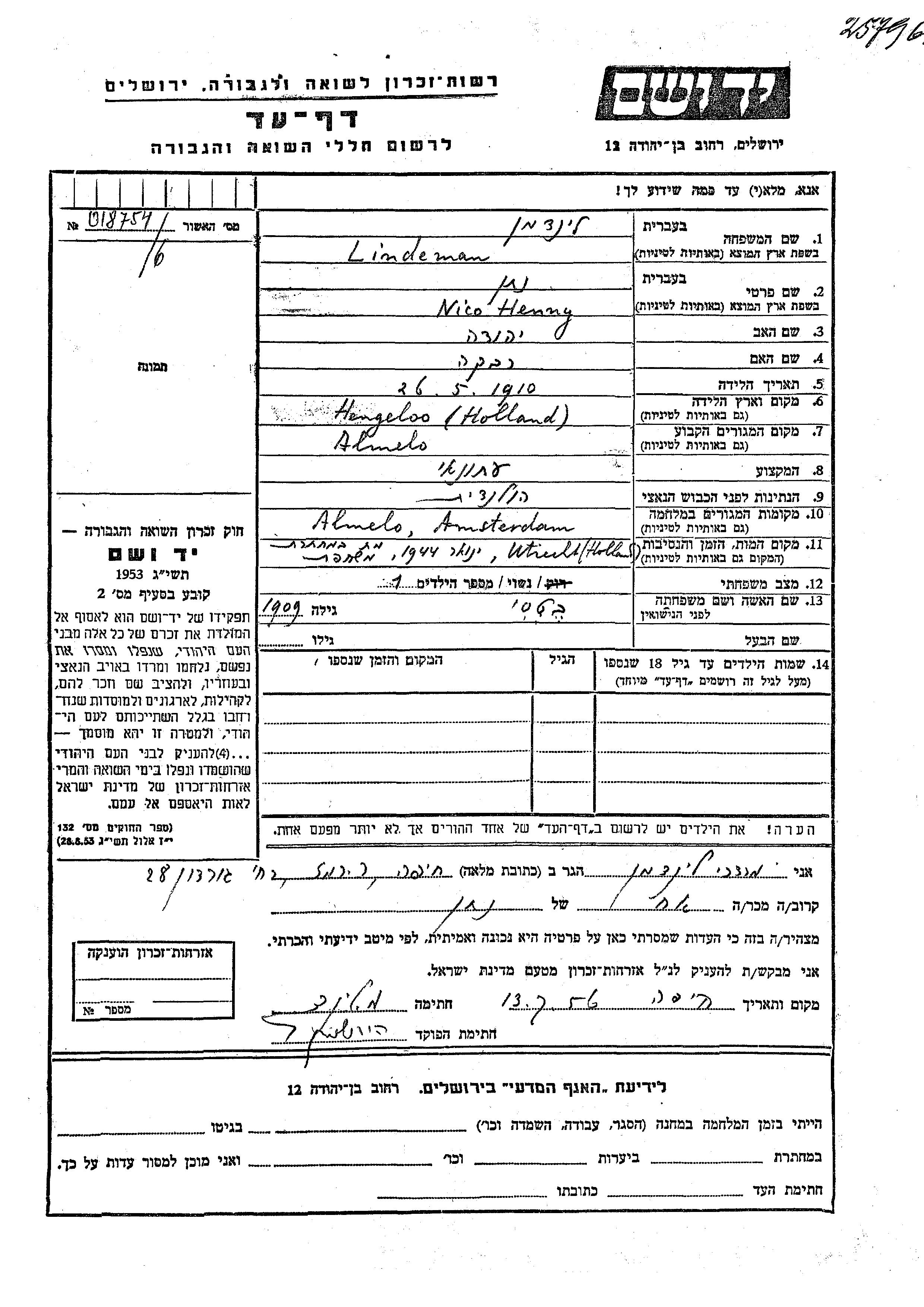 Nico Henny Natan Lindeman wurde im Jahr 1910 in Hengelo, Niederlande geboren. Er war der Sohn von Yehuda und Rivka. Er war Journalist/-in und mit Elizabeta Verheiratet. Vor dem Zweiten Weltkrieg lebte er in Almelo, Niederlande. Während des Krieges war er in Amsterdam, Niederlande.