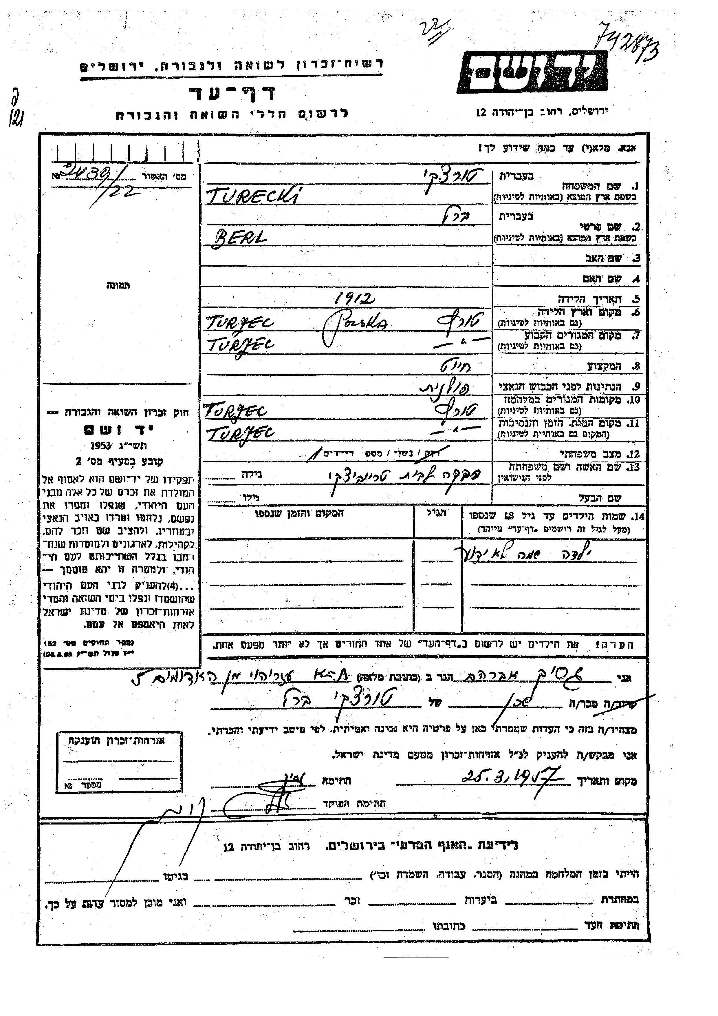 Berl Turecki wurde im Jahr 1912 in Turzec, Polen geboren. Er war Schneider und mit Rivka, geb. Treievitzki Verheiratet. Vor dem Zweiten Weltkrieg lebte er in Turzec, Polen. Während des Krieges war er in Turzec, Polen.