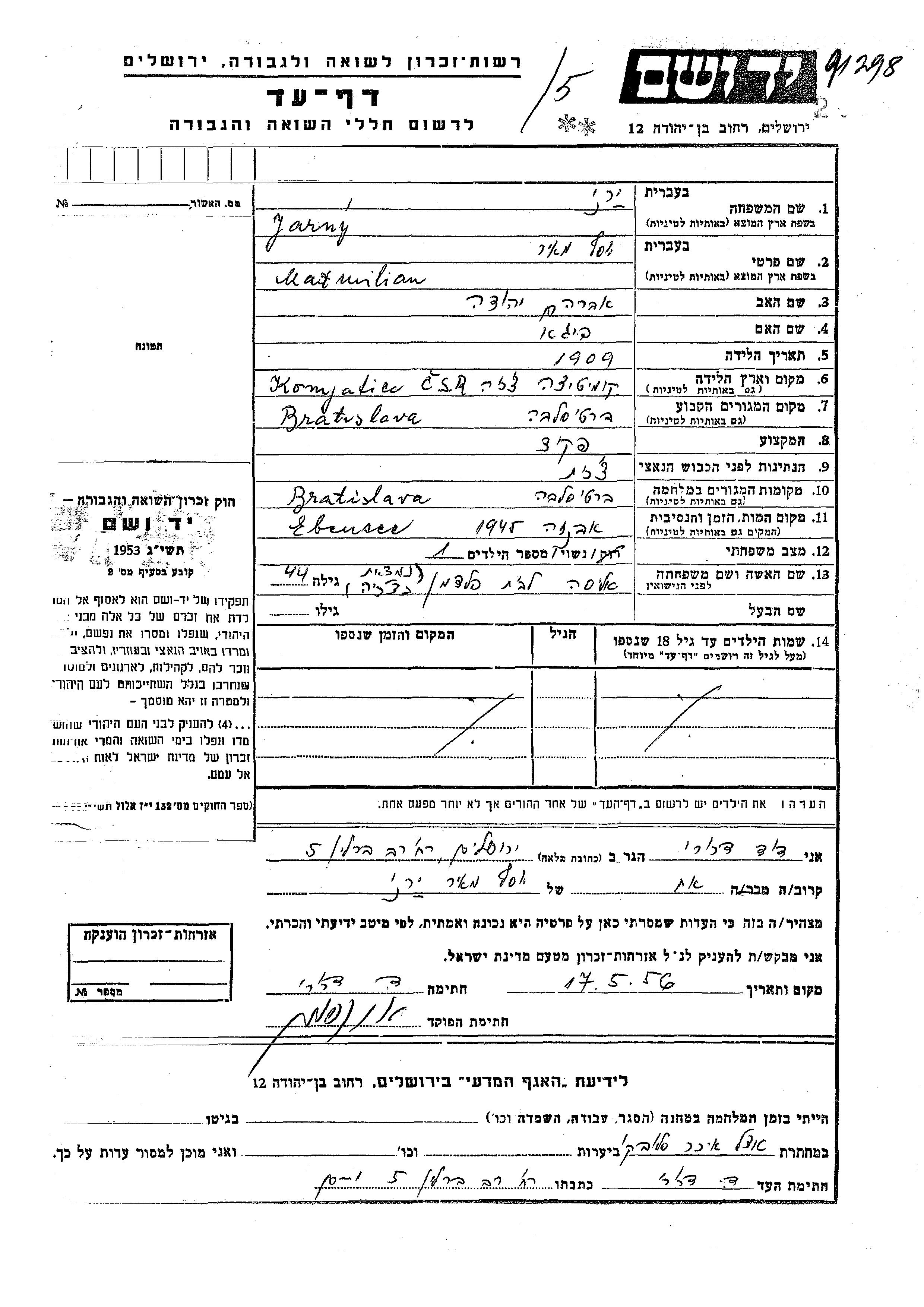 Maximilian Yosef Meir Jarny wurde im Jahr 1909 in Komjatice, Tschechoslowakei geboren. Er war der Sohn von Avraham Yehuda und Feiga. Er war Angestellte/-r und mit Alisa, geb. Feldman Verheiratet. Vor dem Zweiten Weltkrieg lebte er in Bratislava, Tschechoslowakei. Während des Krieges war er in Bratislava, Tschechoslowakei.
