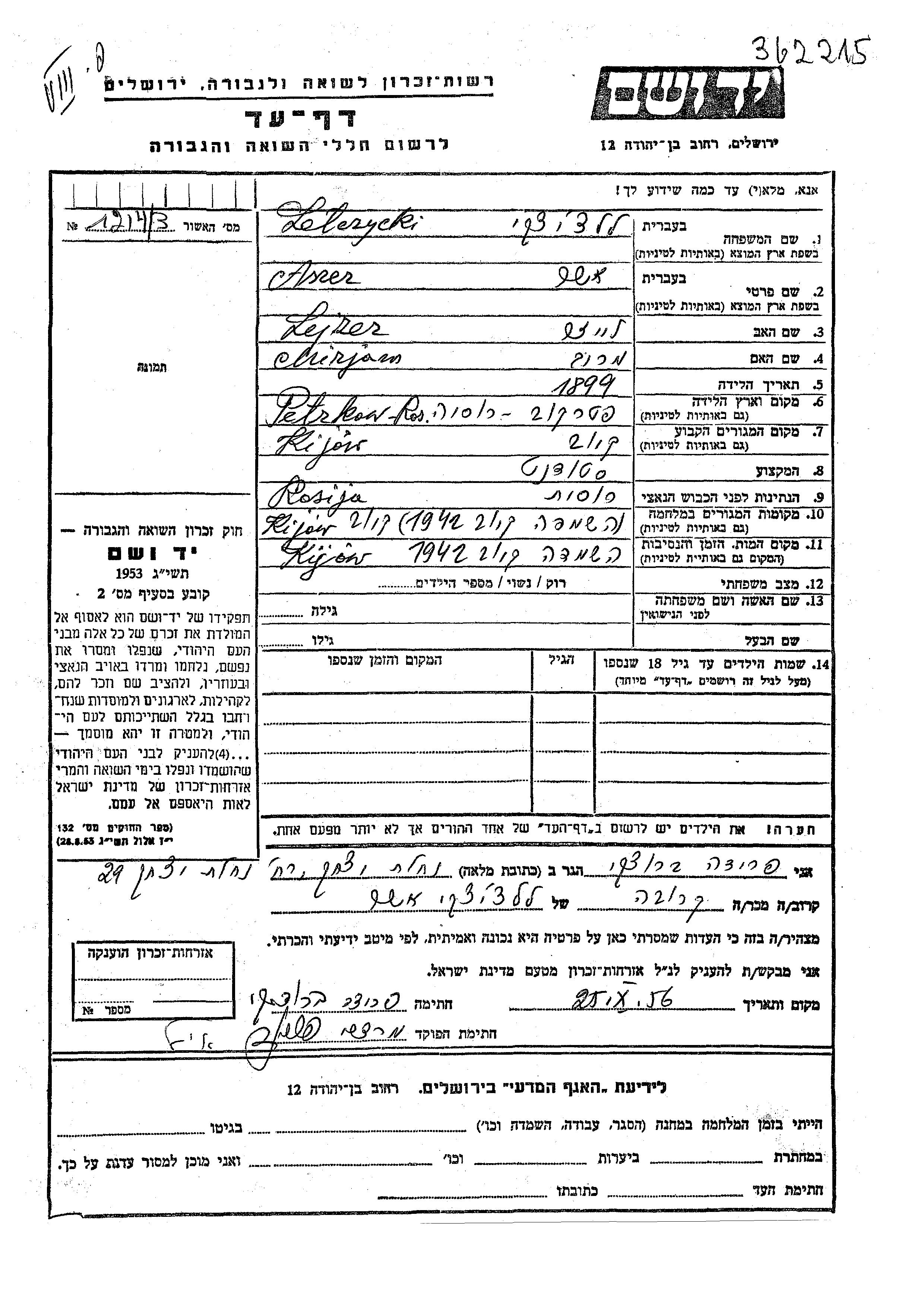 Aszer Lelczycki wurde im Jahr 1899 in Petrikov geboren. Er war der Sohn von Lejzer und Mirjam. Er war Student. Vor dem Zweiten Weltkrieg lebte er in Kijow, Ukraine (UdSSR). Während des Krieges war er in Kijow, Ukraine (UdSSR).