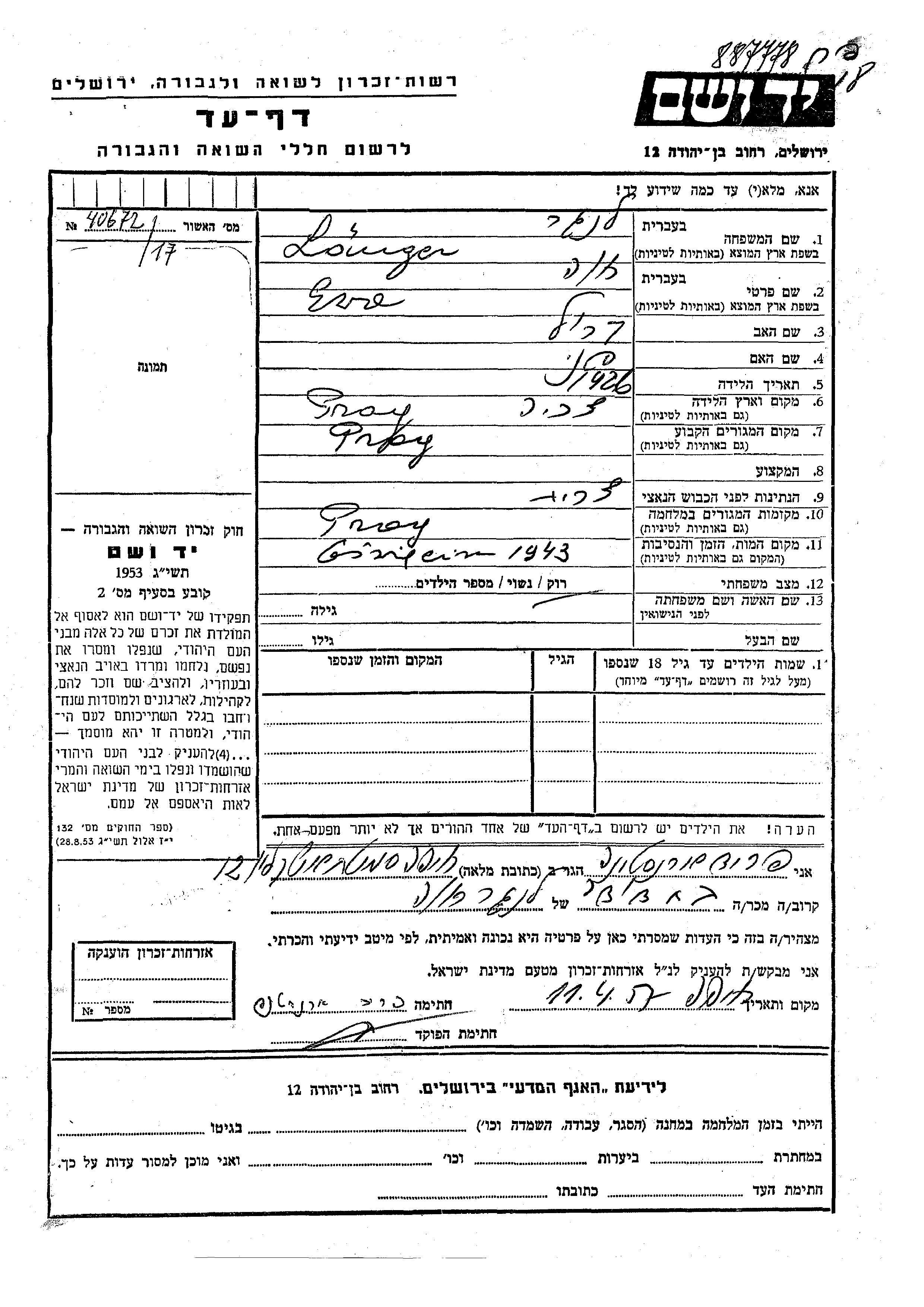 Eva Khava Langer wurde im Jahr 1926 in Prague, Tschechoslowakei geboren. Sie war die Tochter von Karol und Fani. Sie war Ledig. Vor dem Zweiten Weltkrieg lebte sie in Prague, Tschechoslowakei. Während des Krieges war sie in Prague, Tschechoslowakei.