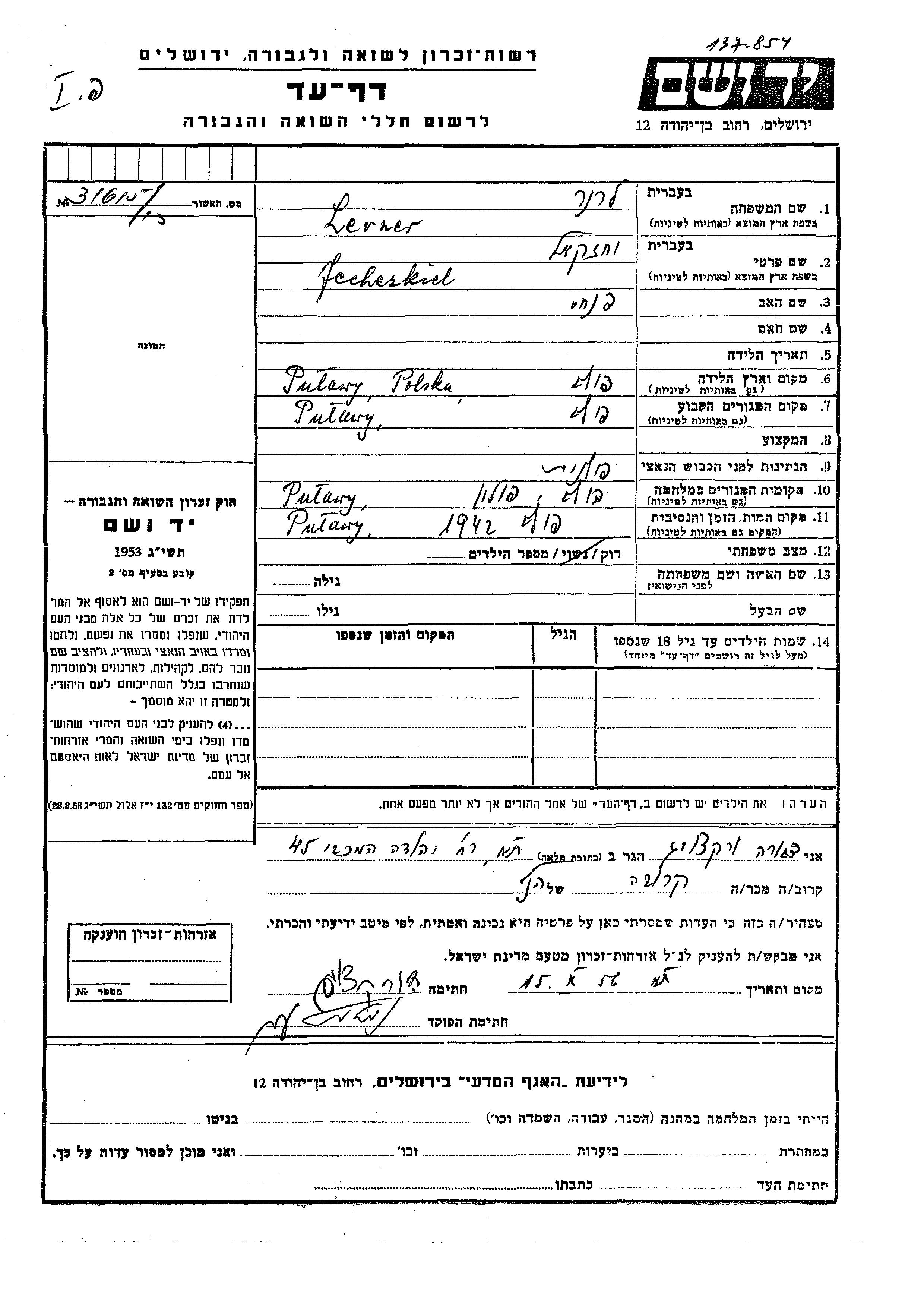 Jechezkiel Lerner wurde in Pulawy, Polen geboren. Er war der Sohn von Pinkhas. Er war Ledig. Vor dem Zweiten Weltkrieg lebte er in Pulawy, Polen. Während des Krieges war er in Pulawa, Polen.