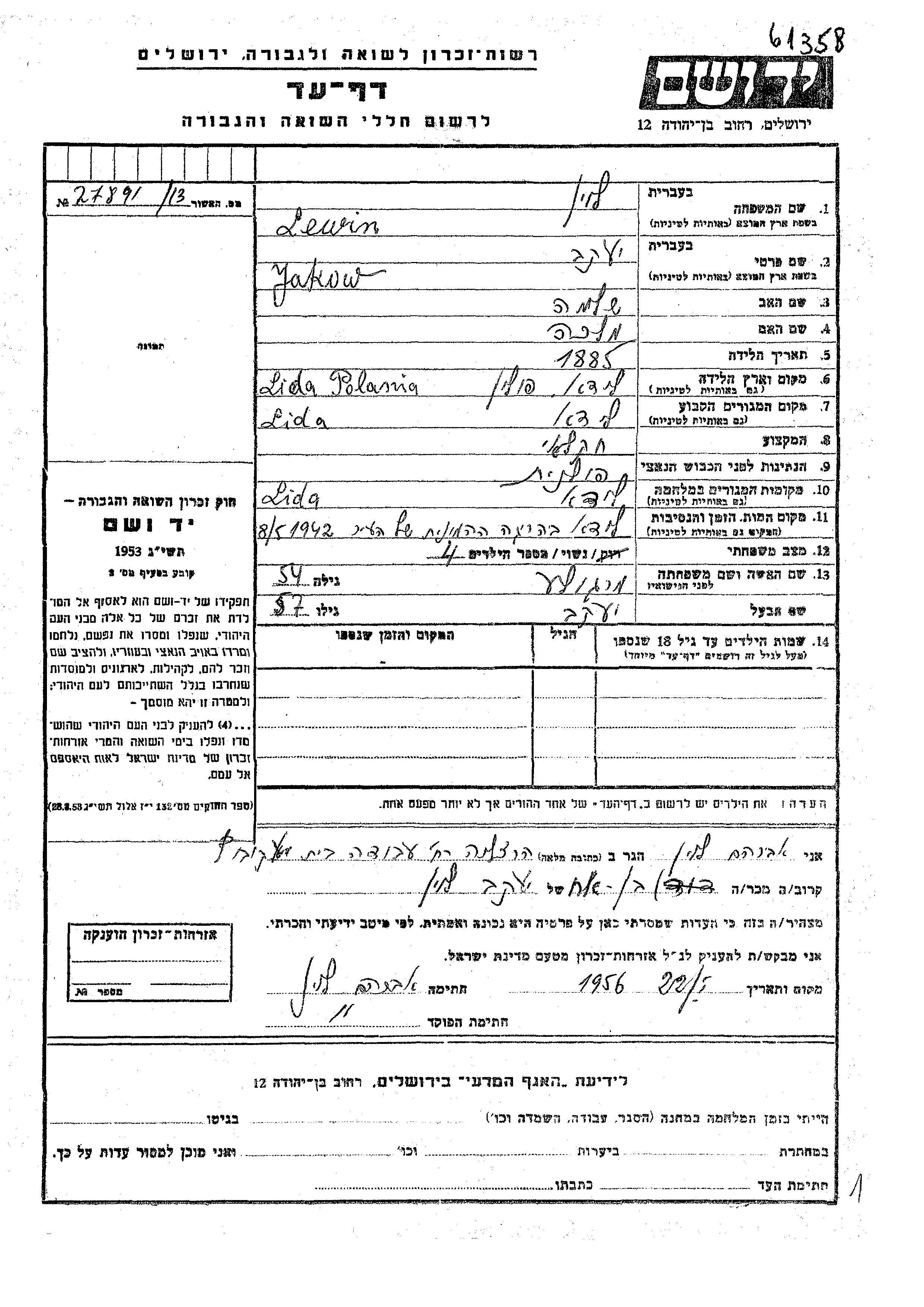 Yakow Lewin wurde im Jahr 1885 in Lida, Polen geboren. Er war der Sohn von Shlomo und Malka. Er war Landwirt und mit Margole Verheiratet. Vor dem Zweiten Weltkrieg lebte er in Lida, Polen. Während des Krieges war er in Lida, Polen.