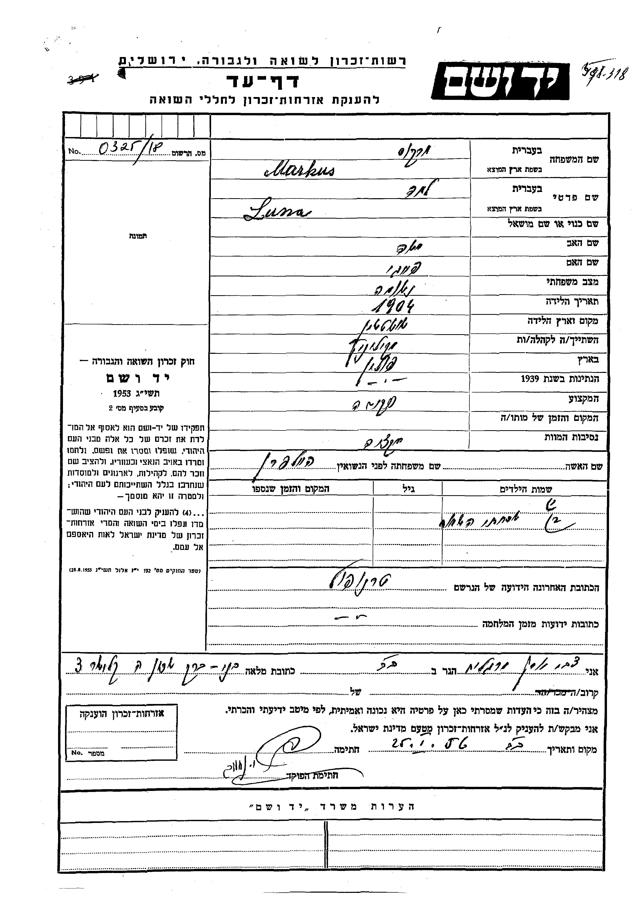 Lea Luna Markus, geb. Heilpern wurde im Jahr 1904 in Suszczyn, Polen geboren. Sie war die Tochter von Moshe und Feigi. Sie war Angestellte/-r und Verheiratet. Vor dem Zweiten Weltkrieg lebte sie in Mikulincie, Polen. Während des Krieges war sie in Tarnopol, Polen.