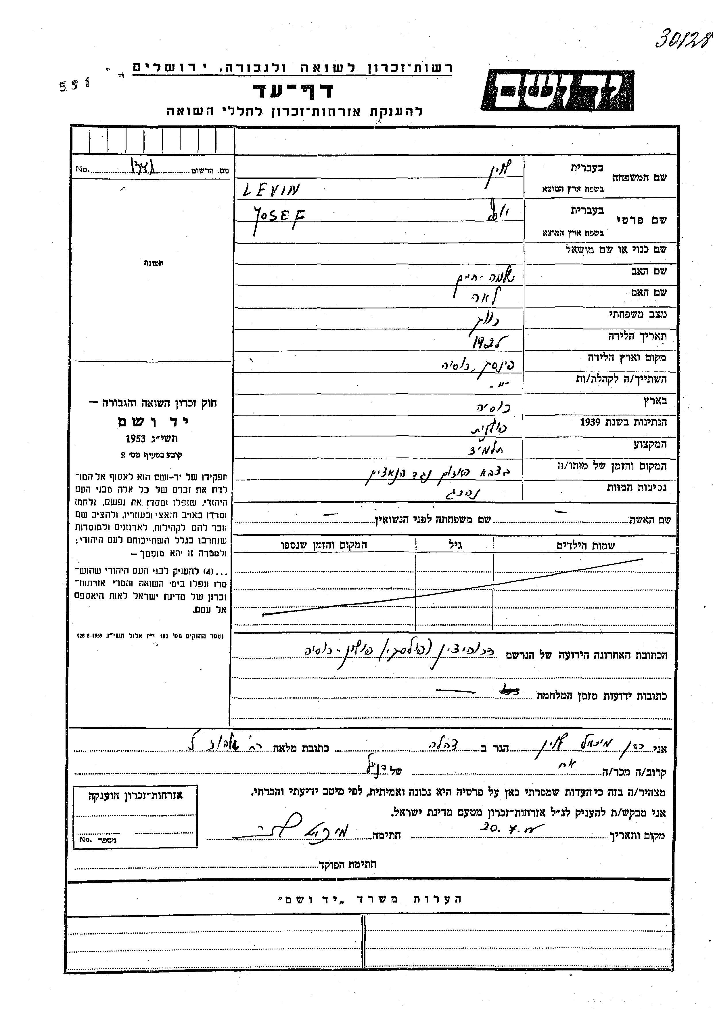 Josef Levin wurde im Jahr 1925 in Pinsk, Polen geboren. Er war der Sohn von Shlomo Khaim und Lea. Er war Schüler/-in und Ledig. Vor dem Zweiten Weltkrieg lebte er in Drohiczyn, Polen. Während des Krieges war er in Drohiczyn, Polen. Josef im Militärdienst umgekommen. Todesort: die Sowjetischen Streitkräfte.