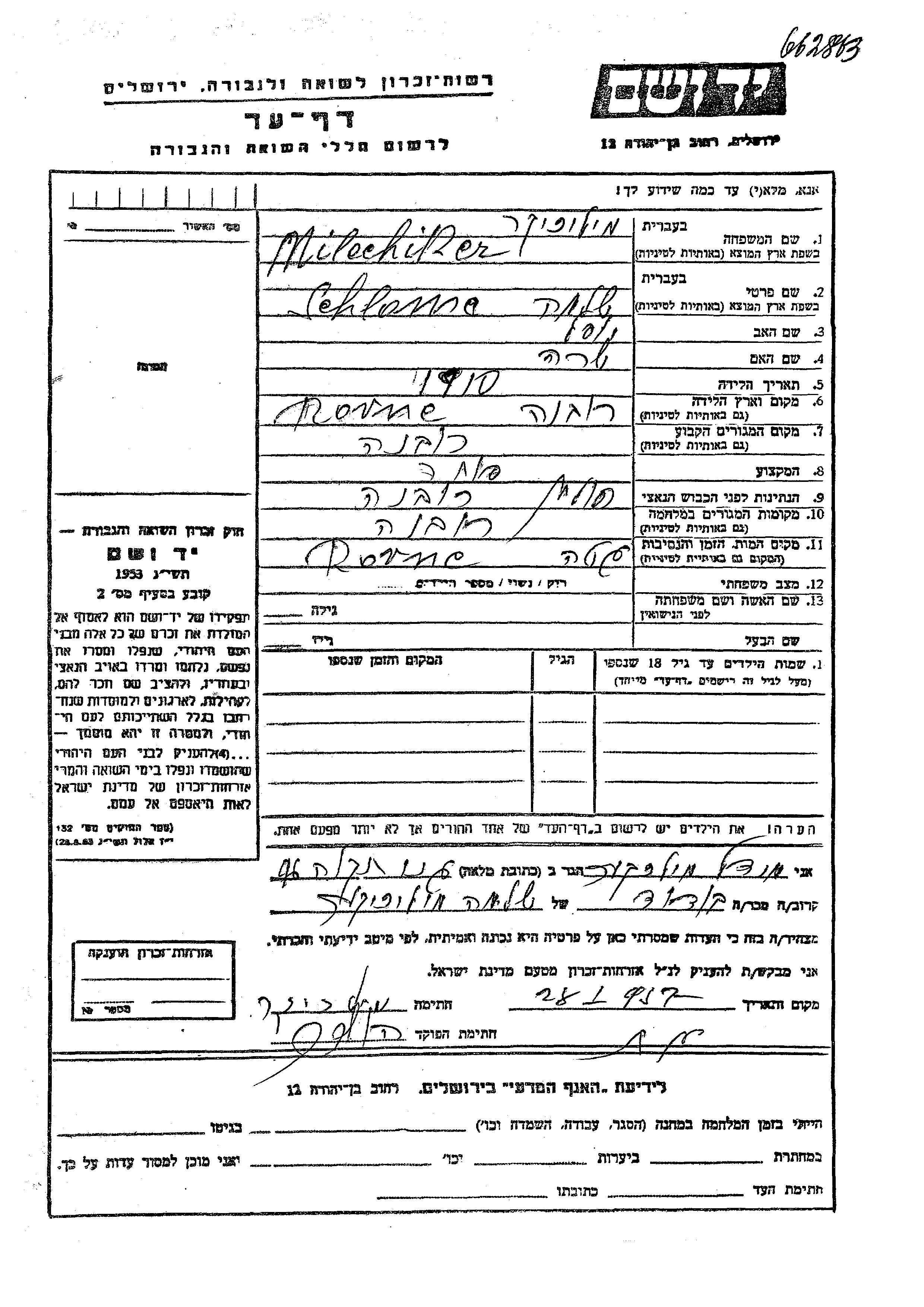 Schlomo Milechiker wurde im Jahr 1910 in Rowne, Polen geboren. Er war der Sohn von Yosel und Sara. Er war Kaufmann/-frau. Vor dem Zweiten Weltkrieg lebte er in Rowne, Polen. Während des Krieges war er in Rowne, Polen.