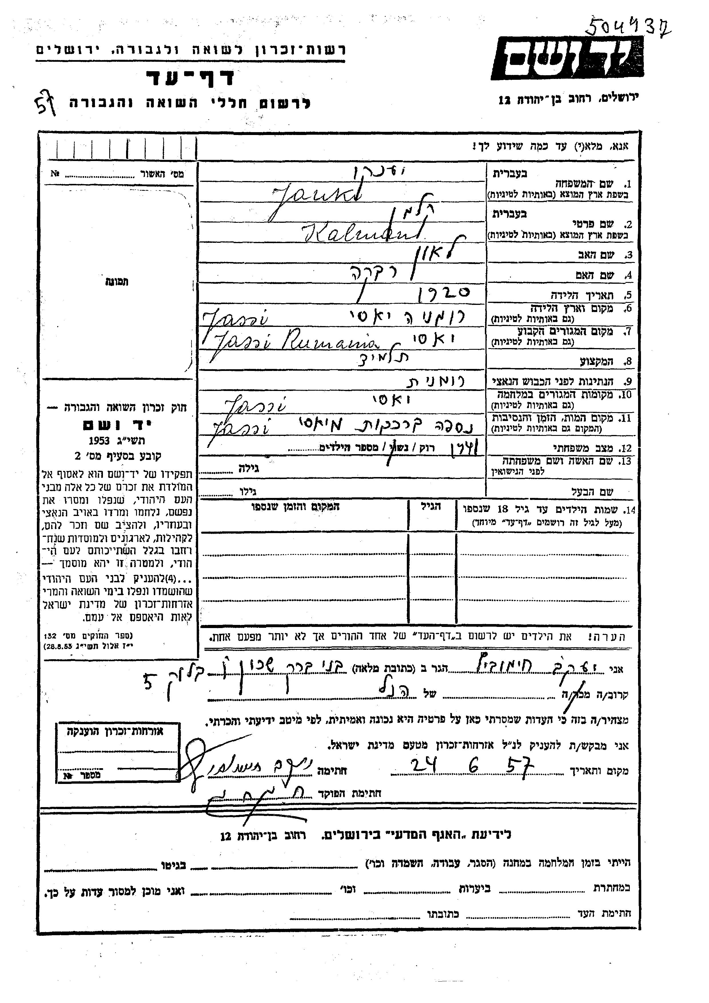 Yanko Kalman wurde im Jahr 1920 in Jas, Rumänien geboren. Er war der Sohn von Leon und Rivka. Er war Schüler/-in und Ledig. Vor dem Zweiten Weltkrieg lebte er in Jas, Rumänien. Während des Krieges war er in Jas, Rumänien.